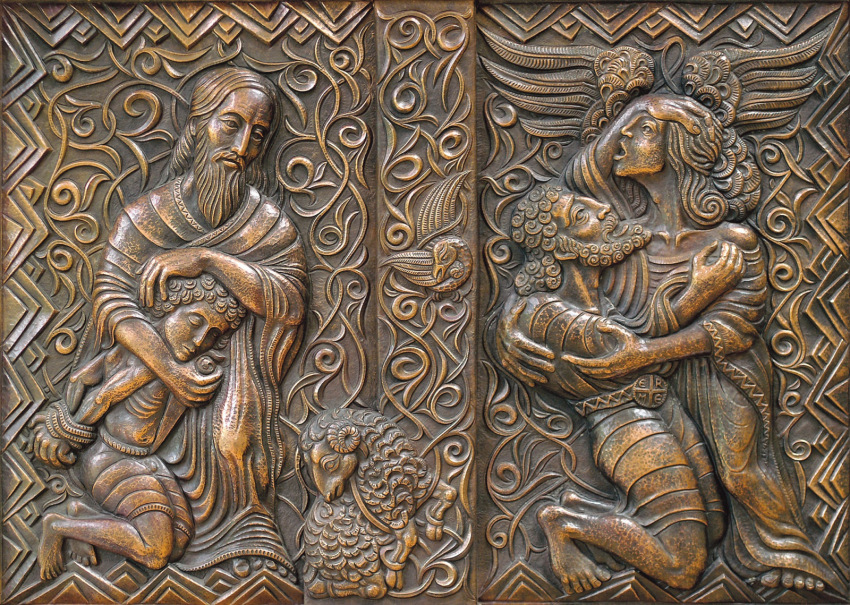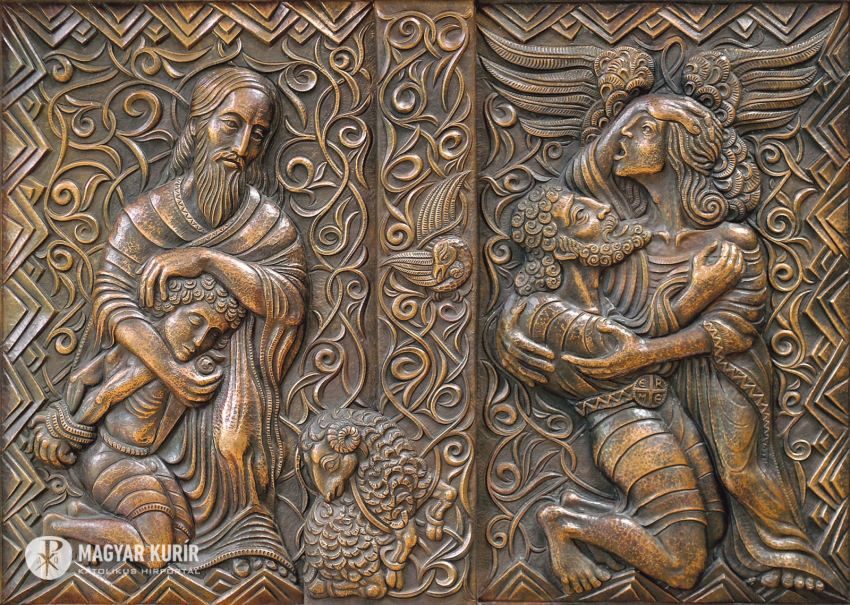 – Előfordultak nézetkülönbségek kettőnk között vagy a gyerekekkel kapcsolatban, és ilyenkor érezni lehetett, őrlődik magában amiatt, hogy esetleg másképpen gondol valamit. Sohasem kiabált, magában tartotta az indulatait, nemcsak a családban, hanem a tágabb környezetében is. Adódtak az életében megalázó helyzetek a munkáival kapcsolatban, de hittel és imádsággal le tudta győzni ezeket. Szép tulajdonsága volt, hogy mindig tudott bocsánatot kérni, ha úgy érezte, hogy valakit megbántott. Ha például reggel vitáztunk valamin, akkor biztos, hogy hamarosan telefonált, és bocsánatot kért. De nemcsak tőlem, hanem a gyerekektől és másoktól is, ha úgy érezte, hogy igazságtalan volt vagy erőteljesebben szólt. Egyébként magában az ötvösségben is jelen van önmagunk legyőzésének a motívuma. Ábrahám és Izsák története például rendkívül nehéz, feszítő téma. Ez a pátyi római katolikus templomnak készített bronzkapu egyik jelenete. A kapu Csaba halála miatt csak részben készült el, kétméteres magasságig. Az ötvösművész hosszú heteken keresztül dolgozik ezzel a ma már kevesek által alkalmazott, nehéz, ősi technikával, míg rengeteg kis kalapácsütéssel kidomborít egy jelenetet. Ezalatt végig ott él benne az indulat, átérzi a történetet. A kalapálás ugyanakkor aprólékos, kitartó munkát igényel, és ennek a kettőnek van egy erős feszültsége. Csaba sem volt mindig az alkotókedve csúcsán, de olyankor működött benne a munkához való hűség. Tudta, hogy akkor is alkotni kell, ha nem fűti az embert az ihlet; ilyenkor legfeljebb a kevésbé lényeges részeken dolgozott, például nem az arcon. A végeredmény pedig a csodával határos. A boldoggá avatáshoz szükség van egy csodára, de úgy érzem, Csaba művészetében nagyon sok a csodás elem. Szinte megmagyarázhatatlan, hogyan lehet olyan kifejező Krisztus vagy a Szűzanya arca az óbudavári templom szentélyének oltárán elhelyezett egységkereszten vagy a kelyheken. Hiszen a művész az alkotás fonákján dolgozik, a hátoldalról kalapálja ki az arcokat, s amikor megfordítja, és megnézi az eredményt a pozitív oldalon, már csak igazítani tud rajta.