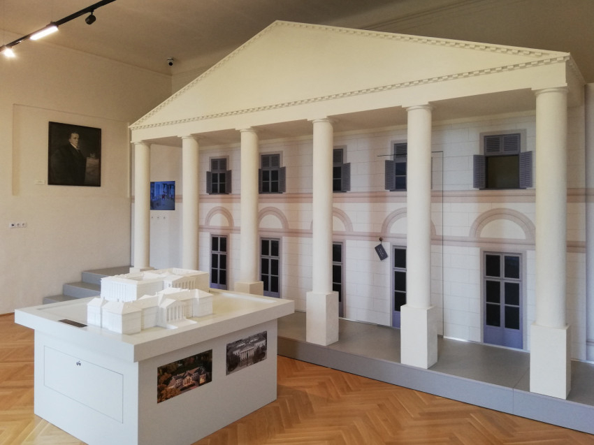 Festetics Antal az ország legnagyszabásúbb kastélyának megtervezésével kora kiemelkedő építészét, a már említett Pollack Mihályt (1773–1855) bízta meg. Az építész háromszintes, U alakú épületet tervezett, amelyet számos melléképület és egy hatalmas tájképi park ölel körül. A kutatások szerint az építkezést 1802 körül kezdték, és 1812-ben már állt a kastély, ekkor építették a park felé nyíló oszlopcsarnokot. Három évvel később a tulajdonosok beköltözhettek új rezidenciájukba, amit eredetileg ugyan reprezentatív céllal építtettek, mégis meghitt családi nyaraló lett belőle. Az épületben megtekinthető kiállításon a kastély és a Nemzeti Múzeum épületéről is látható egy-egy elemeire szedhető, szép fehér makett, amit előszeretettel tanulmányoznak és vesznek kezük ügyébe a gyerekek.