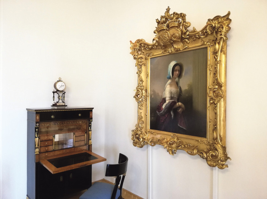 A kiállítás egyik ékessége egy kifogástalan öltözetű 19. századi hölgy, Festetics Wanda grófnő portréja. A modell enyhe mosolya és szépséges ruhája megragadja az embert. Már a kép kerete sem akármilyen, páratlan díszítésű barokk műalkotás. A szép hölgy, Wanda Raczynska grófnő (1819–1845) 1842. január 11-én kötött házasságot Festetics Sámuellel (1806–1862), a dégi kastélyt építtető Festetics Antal és Splényi Amália fiával. A képet Anton Einsle (1801–1871) neves osztrák festő készítette. A keretet a Festetics és a Raczynska család címereivel díszítették.