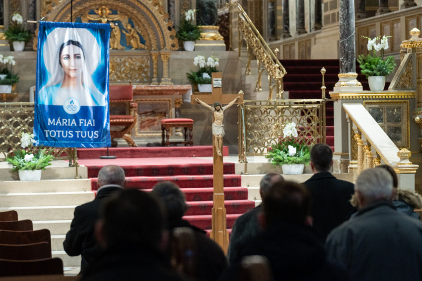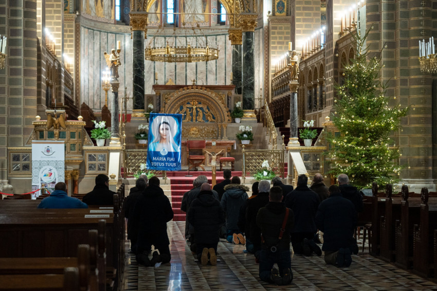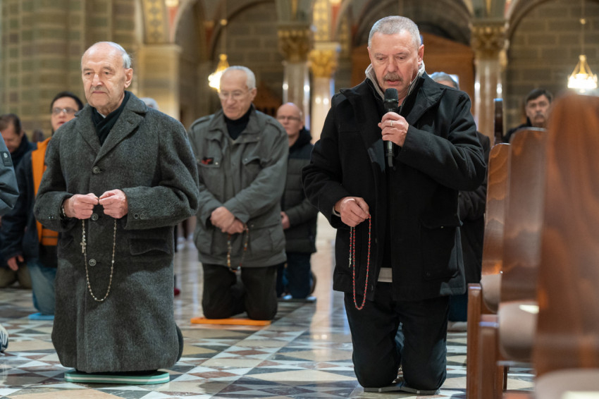 A bazilika szentélye elé felállított kereszt előtt mintegy húsz férfi imádkozta együtt a szentolvasót Fekete Zoltán, a székesegyház káplánja vezetésével.