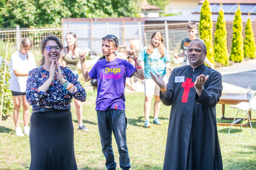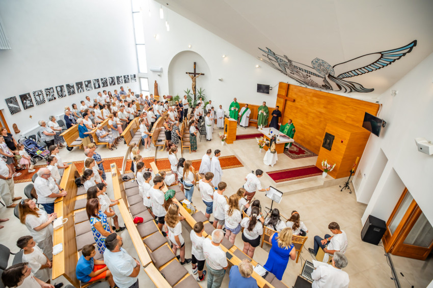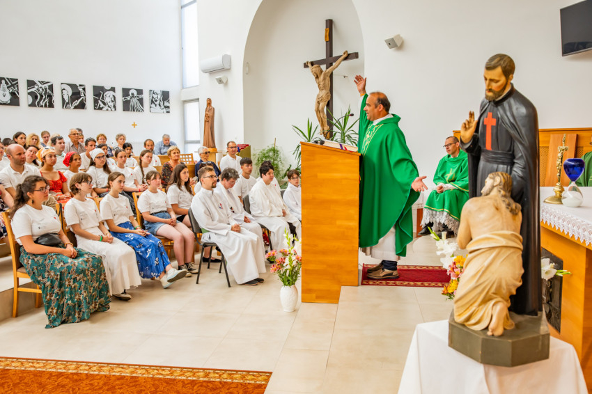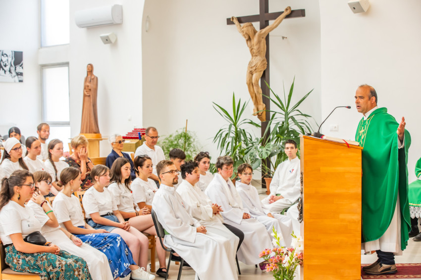 A vasárnapi szentmisén az új tábori pólót viselve vettek részt a fiatalok. A szentmisét a helyi egyházközséggel együtt a borbányai Szent László római katolikus templomban ünnepelték. Frédi atya prédikációjában arra is felhívta a figyelmet, hogy egyik kezünkkel mindig fogjuk Isten kezét, a másikkal meg embertársunkét, utalva ezzel a tábori mottóra is, amely magában foglalja az életprogramot: TaTeSze – találékony, tevékeny szeretet. A programok gördülékeny levezetésében az önkéntesek, a tábor szervezői és az intézmény dolgozói fáradságot nem ismerve szolgálták a táborozók mindennapi örömét.