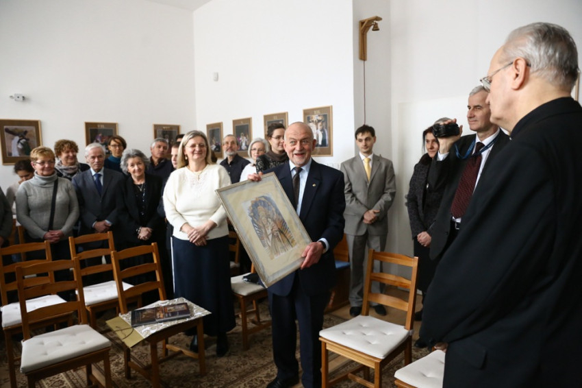 A rádió munkatársaival való találkozás elején Szabó Tamás, a Mária Rádió elnöke köszöntötte Erdő Péter bíborost, átadva neki a Mária Rádió ajándékát. Az átadott festmény, amely a Csíksomlyói Szűzanyát ábrázolja, a rádió munkatársainak Mária gondoskodásába vetett reményét fejezi ki. Amint arra az igazgató rámutatott, 2005 májusában, pünkösd éjjelén, öt évi nehéz és eredménytelen munka után a Csíksomlyói Madonnához fordultak, kérve segítségét a rádió működésében. Ennek a „felajánlásnak” az eredményeként két hónap múlva találtak egy eladó rádióépületet, és találtak olyan önkénteseket, akik vállalták a rádióban való szolgálatot.
