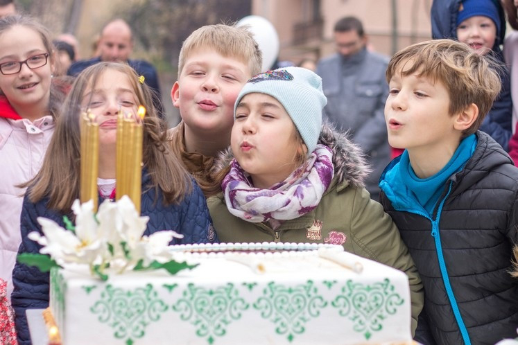 A gyermekek körbeállták a tortát, és erősen koncentrálva legnagyobb kívánságukra együtt elfújták a születésnapi gyertyákat. Következhetett a várva várt pillanat, amikor kicsi és nagy megkóstolta a tortát, a Mókázó együttes vidám zenéje kísérte a kezdődő szülinapi bulit.
