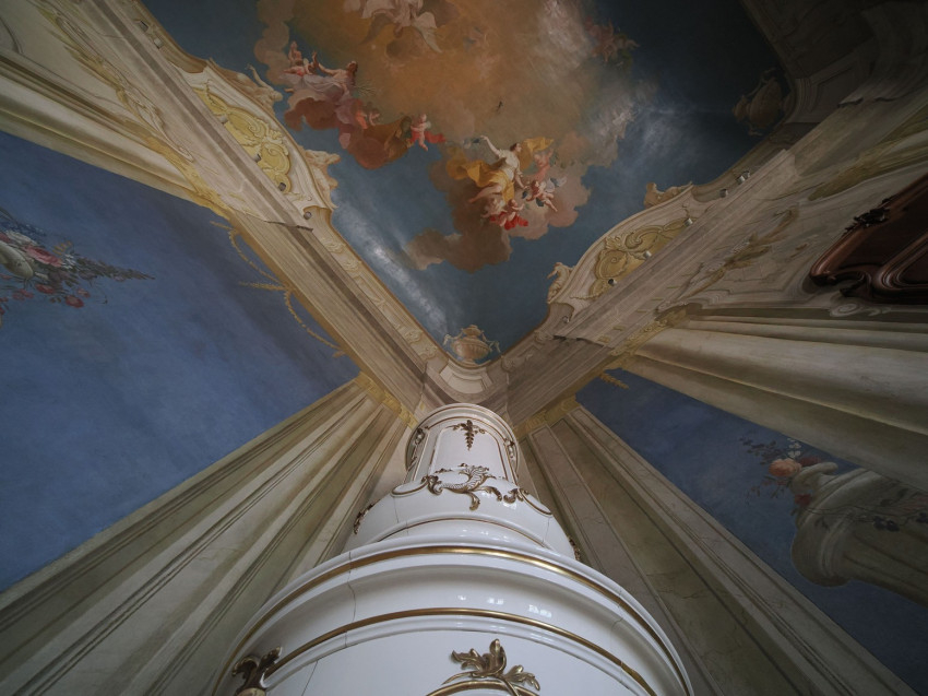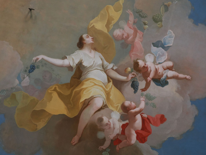 A világegyetemet körforgásban tartó kétarcú istenség, a négy évszakot szimbolizáló női és férfialakok, a bolygók jeleit kezükben tartó puttók és egy titokzatos utalás a 18. században a palotát építtető veszprémi püspök, Koller Ignác születésnapjára – többek között ilyen részletek láthatók a veszprémi érseki palota dísztermének barokk mennyezeti festményén.