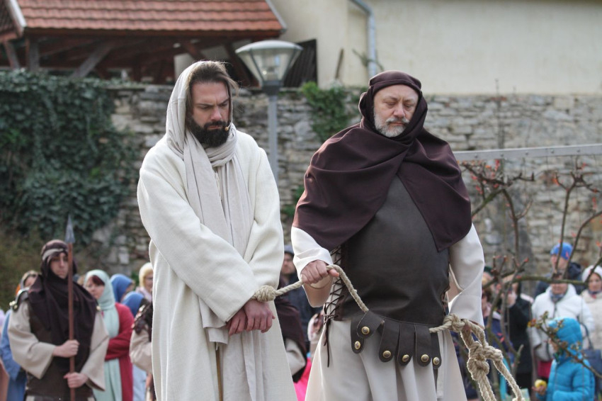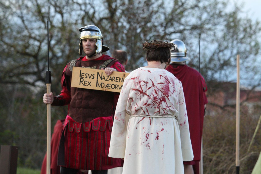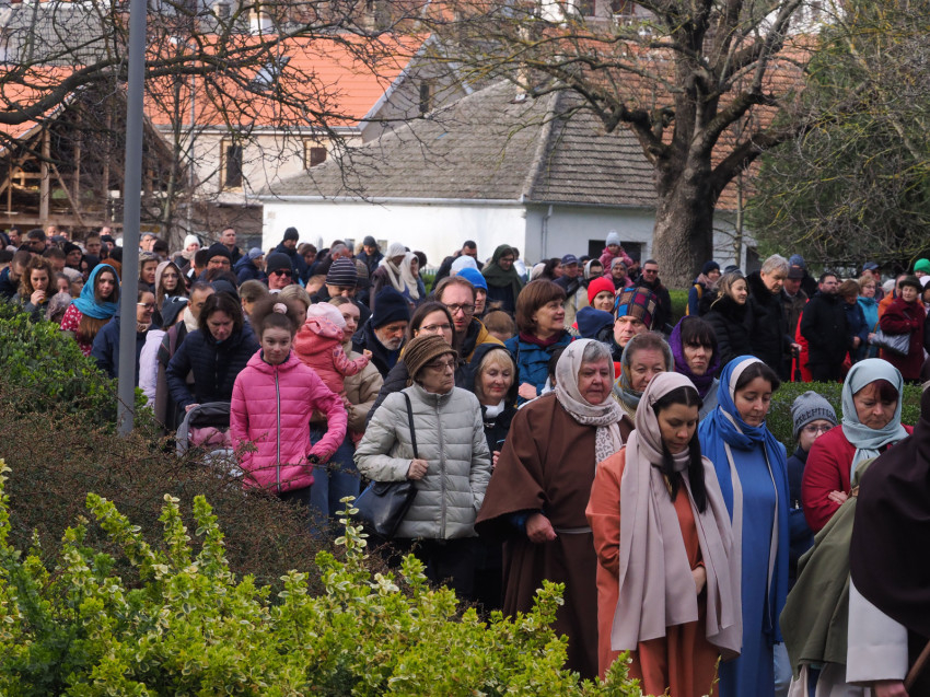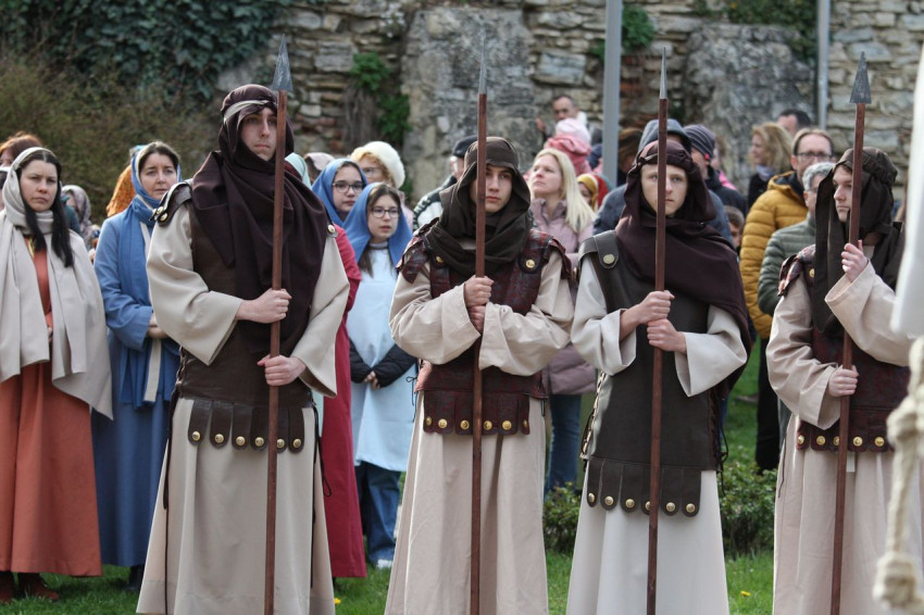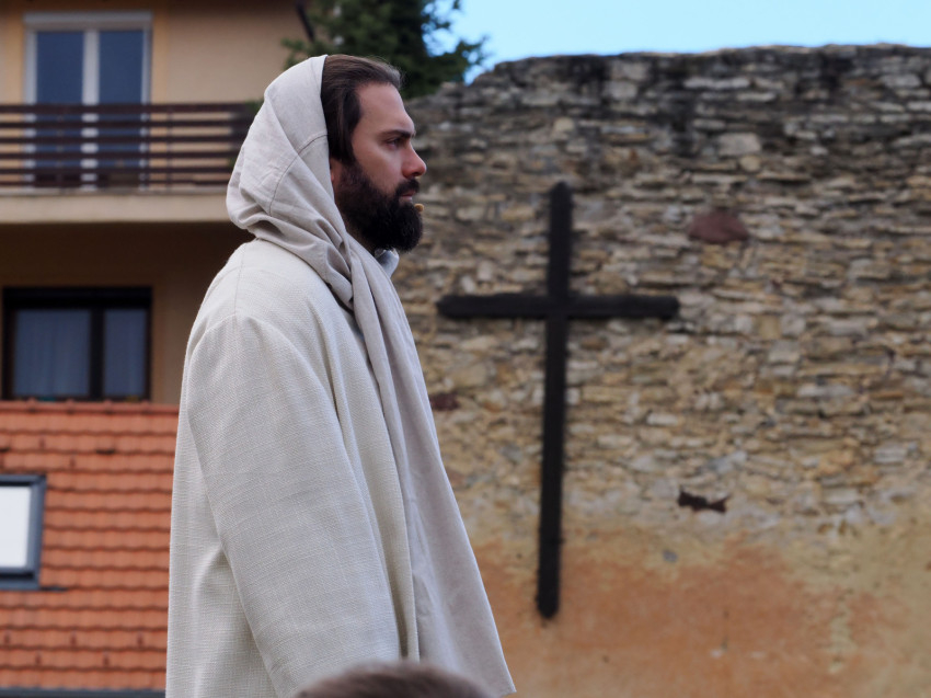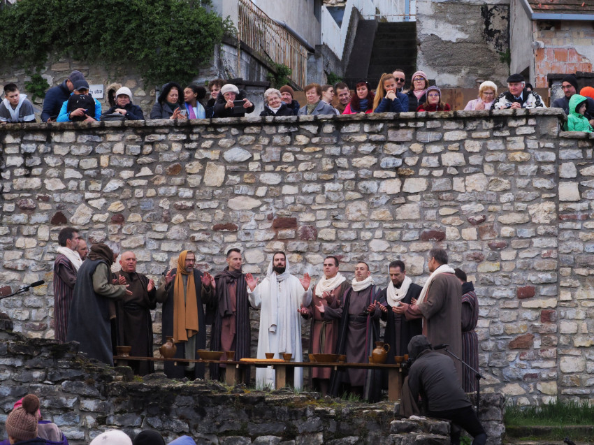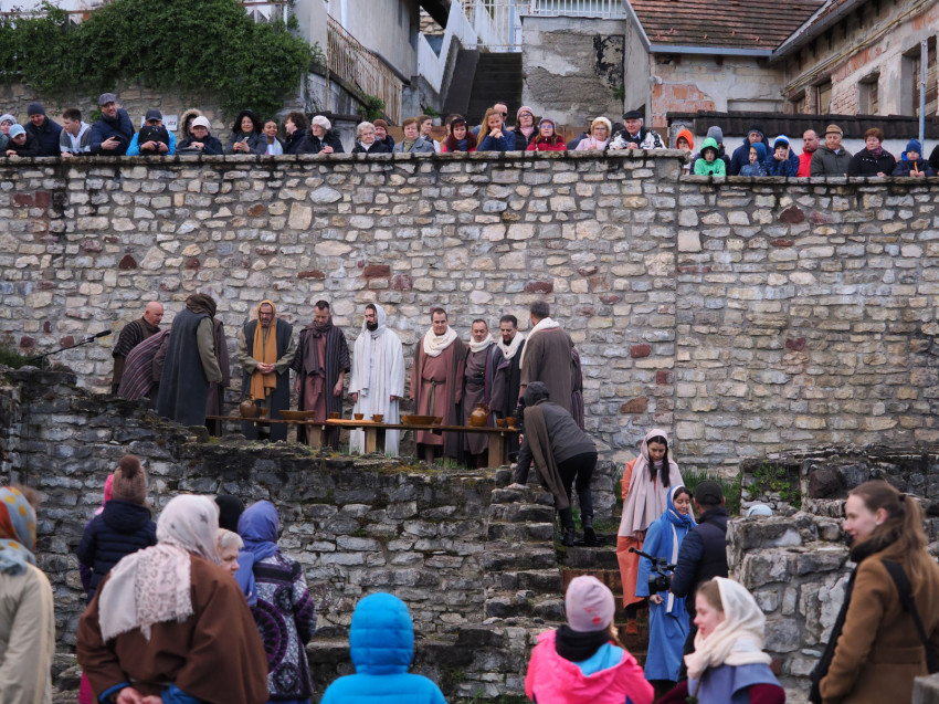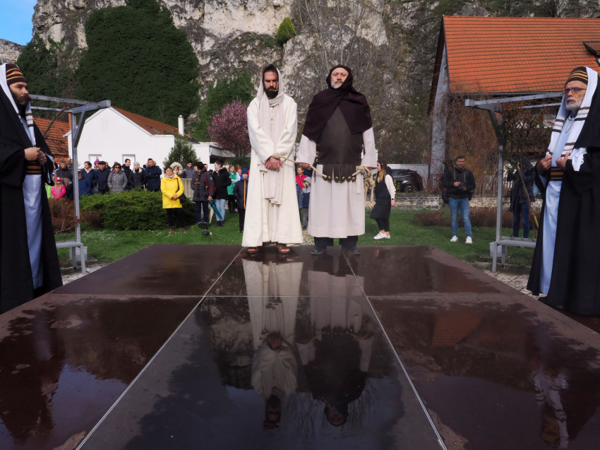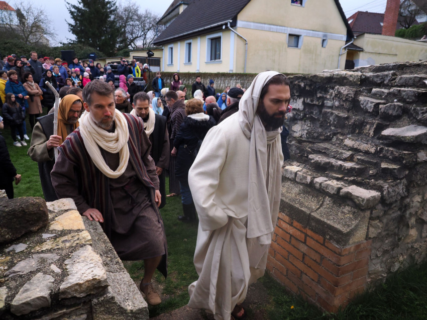 Jézus szenvedéstörténete Kiss György rendezésében elevenedett meg. A megrendítő misztériumjátékot több mint ezer néző követte a Margit-romoktól a rózsakerten és a Patak téren át a Benedek-hegyig, akiknek kedvét a hétvégi erőteljes lehűlés, a jégdara és a feltámadó szél sem vette el.