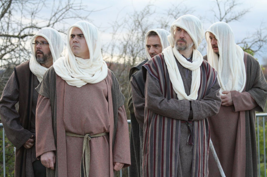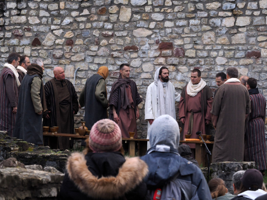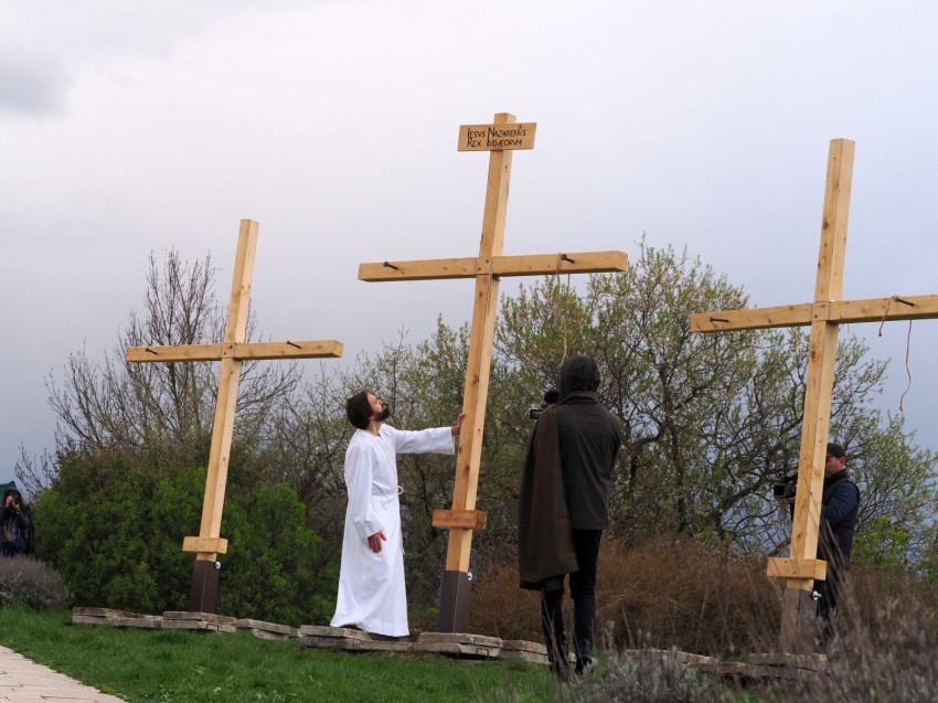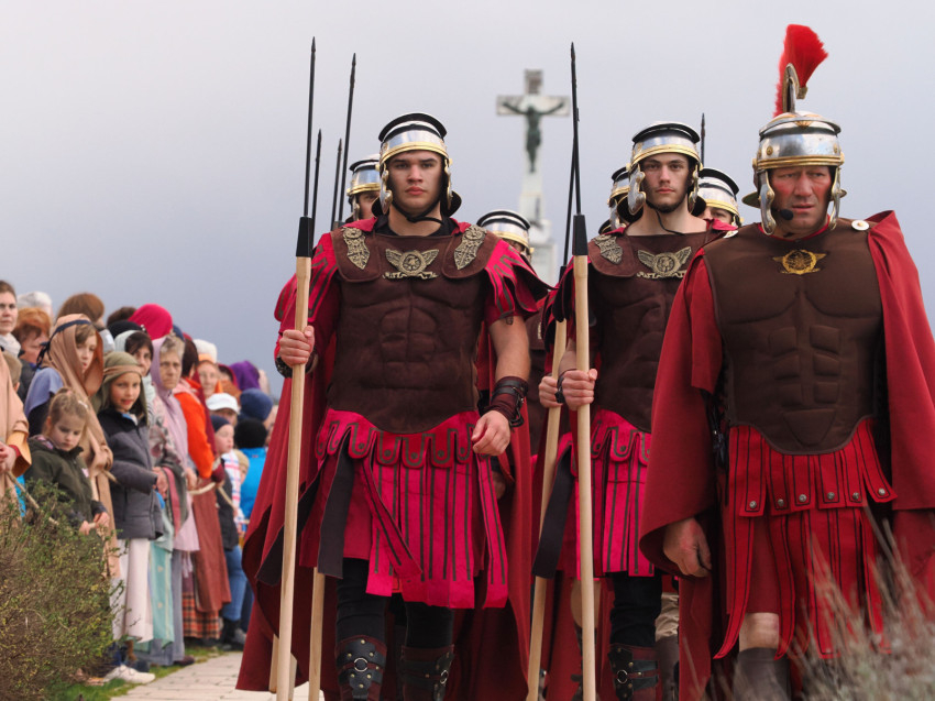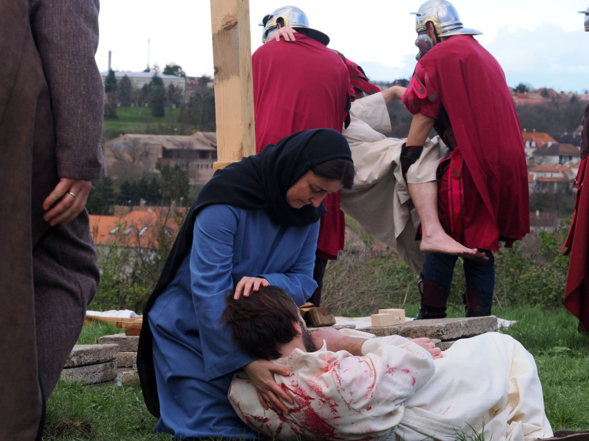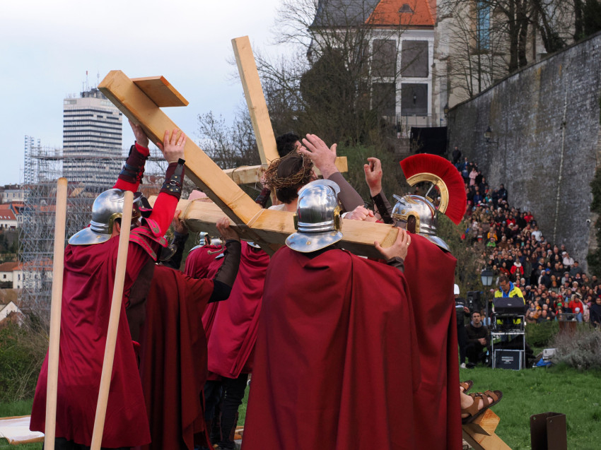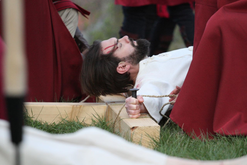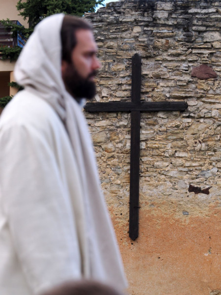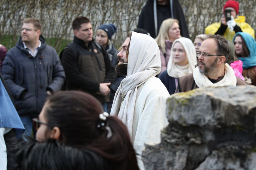 Jézus szenvedéstörténete Kiss György rendezésében elevenedett meg. A megrendítő misztériumjátékot több mint ezer néző követte a Margit-romoktól a rózsakerten és a Patak téren át a Benedek-hegyig, akiknek kedvét a hétvégi erőteljes lehűlés, a jégdara és a feltámadó szél sem vette el.
