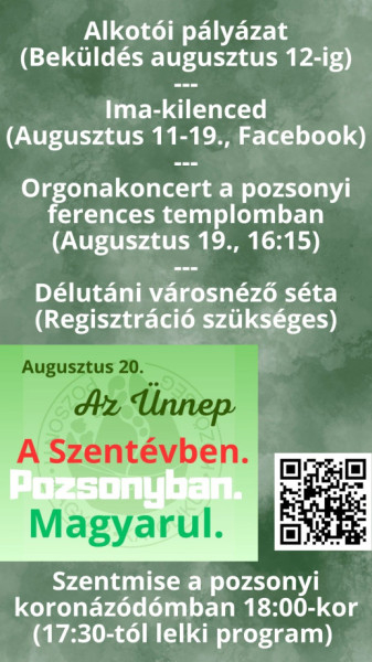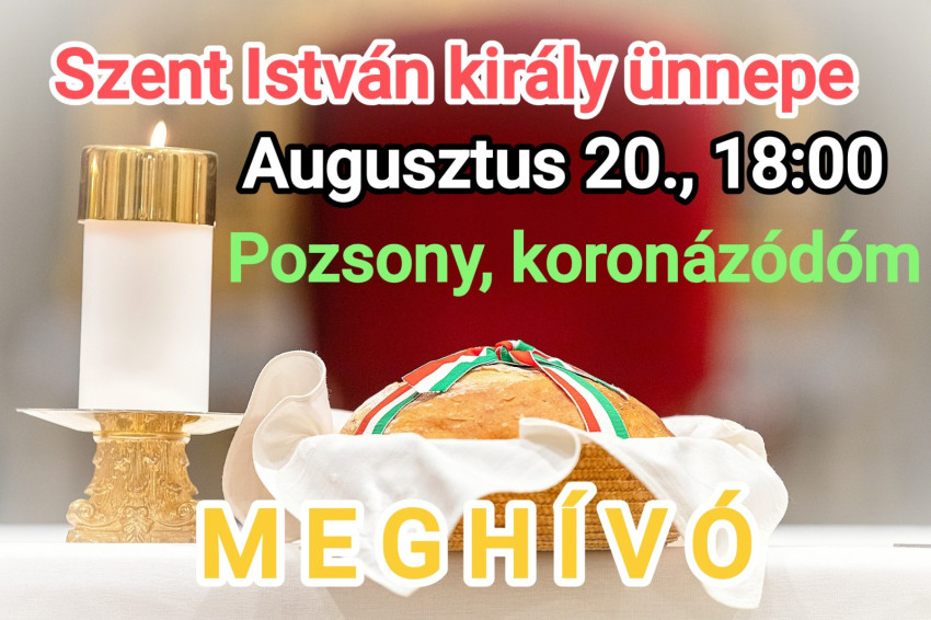 A Pozsonyi Magyar Katolikus Közösség alkotói pályázatot hirdet felvidéki magyar gyermekek, fiatalok számára az államalapítás ünnepére Nemzeti ünnepünk – augusztus 20. címmel. Korhatár: 18 éves korig.