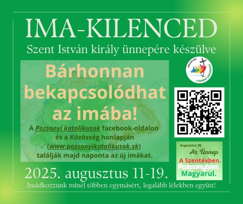 Az imakilenced a pozsonyi közösség Facebook-oldalán lesz követhető augusztus 11–19. között, naponta új részekkel. A kilencedbe bárki bekapcsolódhat.