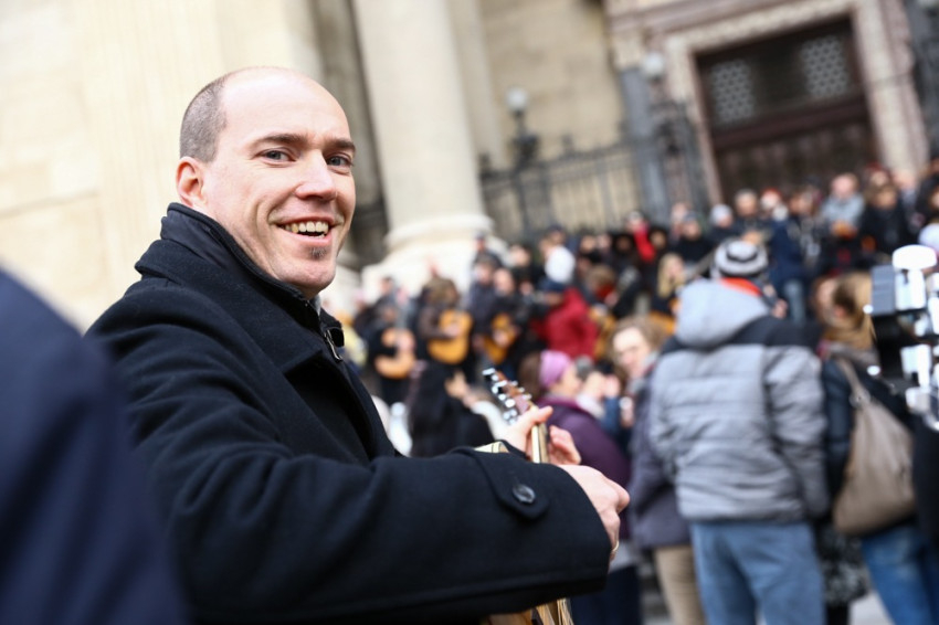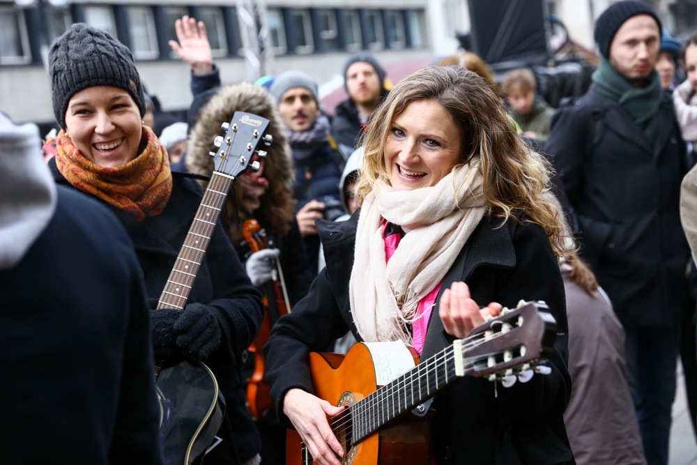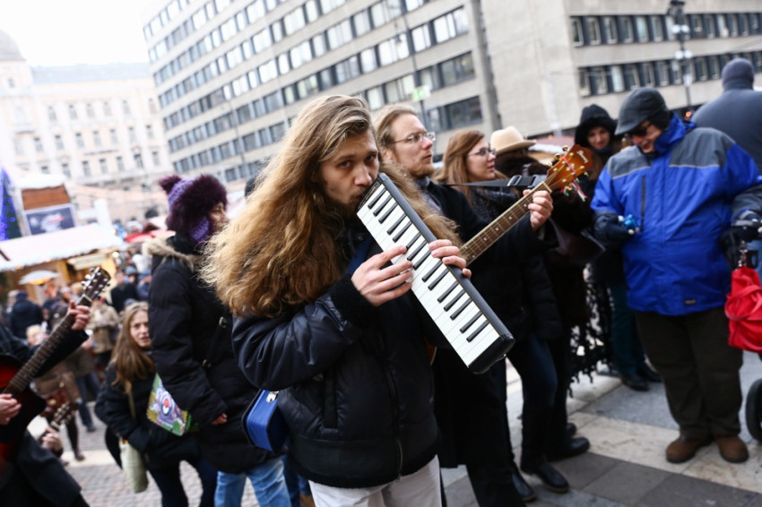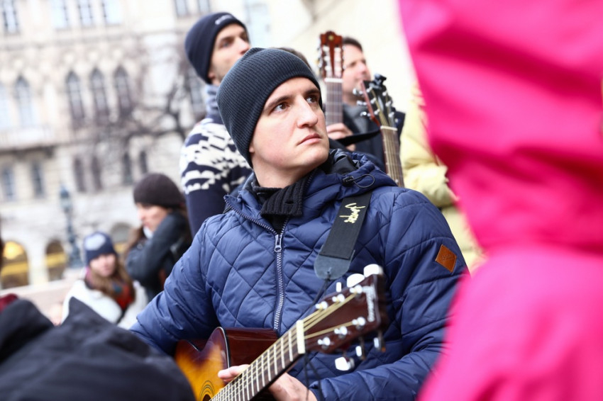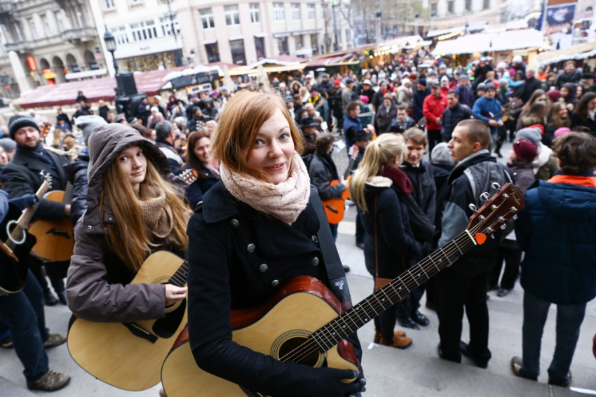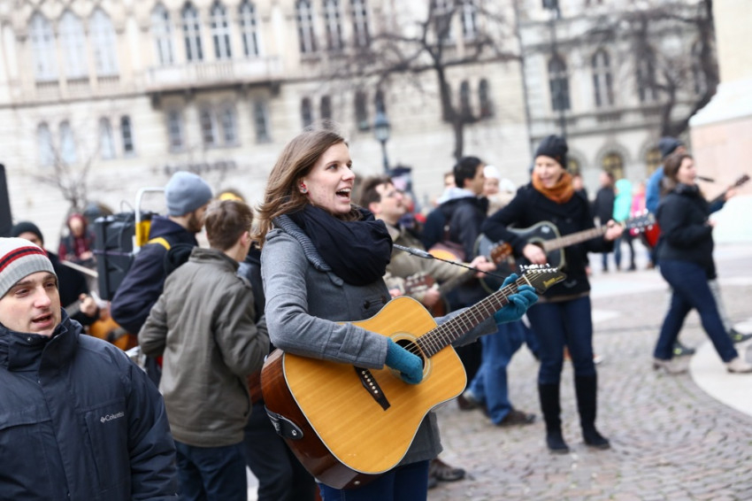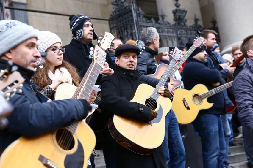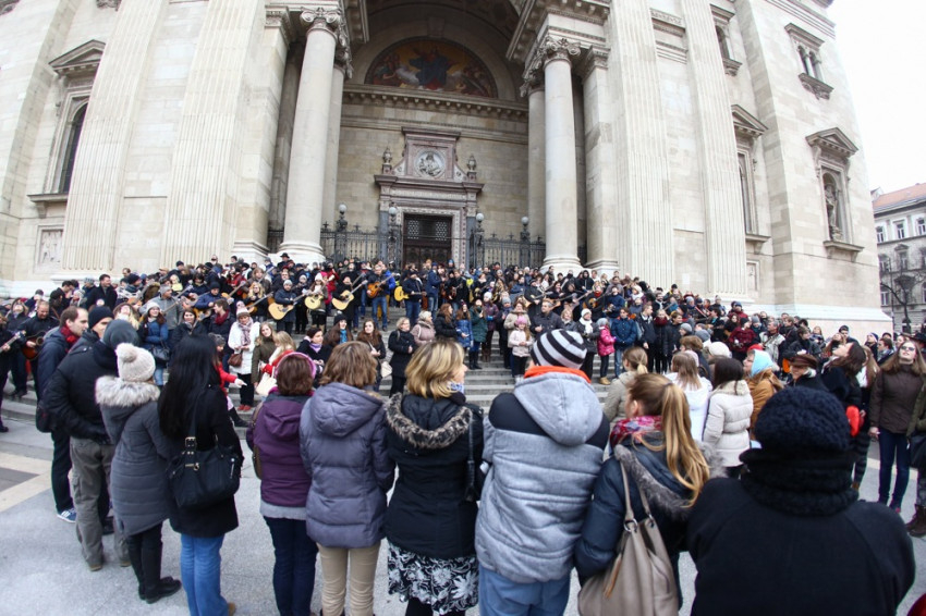 A Csanády Lőrinc és a Boanergész zenekar vezetésével megvalósuló flashmobon az együttes alapítójának, Varga Attilának az Alleluja, Ébredj ember című szerzeményét énekelték a résztvevők, akik a bazilika előtti adventi vásár tömegéből csatlakoztak be a Sas utca felől induló gitáros csapatokba.