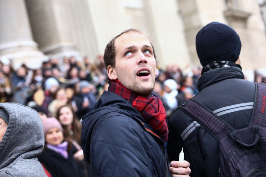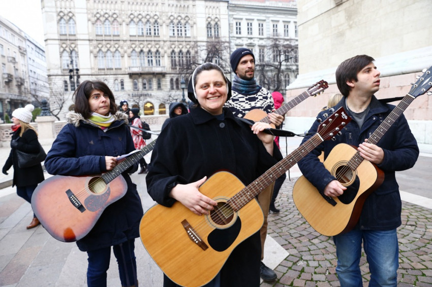 A fagyossá váló idő ellenére a több száz résztvevő nagy derűvel ismételte el háromszor is a koreográfiát, amire a felvétel miatt szükség volt, majd Dobszay Benedek ferences tartományfőnök áldásával bocsátotta útjára a gitárosokat, énekeseket.