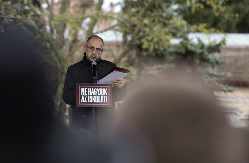 Kelemen Hunor, a Romániai Magyar Demokrata Szövetség (RMDSZ) elnöke beszédet mond a Római Katolikus Gimnázium védelmében rendezett tüntetésen a marosvásárhelyi Vársétányon