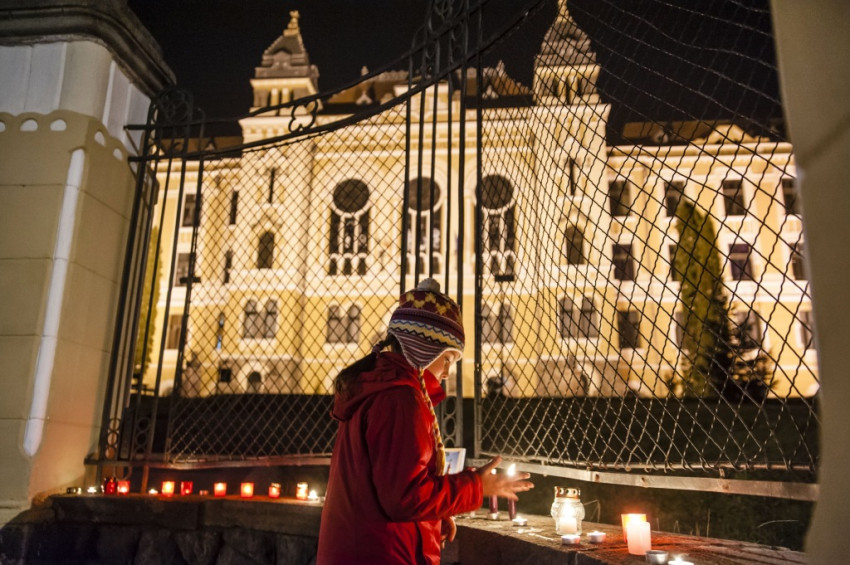 Mécsest gyújt a marosvásárhelyi Római Katolikus Gimnázium védelmében rendezett gyertyagyújtás egyik résztvevője a csíkszeredai Márton Áron Főgimnázium előtt