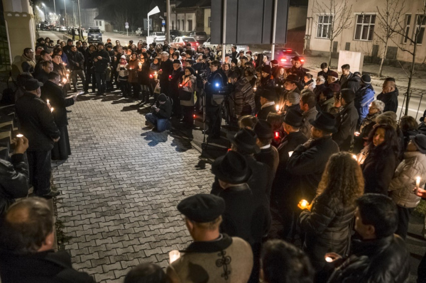 A marosvásárhelyi Római Katolikus Gimnázium védelmében rendezett gyertyagyújtás résztvevői a csíkszeredai Márton Áron Főgimnázium előtt