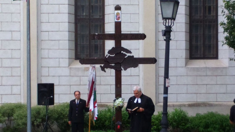 Emlékbeszédet Szakály Sándor történészprofesszor, a Veritas Történetkutató Intézet főigazgatója mondott. Úgy fogalmazott, el kell gondolkoznunk azon, hogy nem voltak-e olyan pillanatok, amikor megfeledkeztek rólunk: az égiek vagy a földiek. Lehet, hogy az égiek segítettek volna, de 1920. június 4-én Versailles-ban a Nagy Trianon-palotában ezt akkor nem tették meg. Egy több mint ezer éves ország hullott elemeire és romjaira. Romjaira, mert romokká váltak azok az egykoron épített kapcsolatok, várak, épületek, amelyek nemzetté formálták azt a magyarságot, amely a Kárpát-medencében évszázadok viharait volt kénytelen túlélni. A szónok kiemelte, a megaláztatás, kisemmizettség ellenére is legyünk büszkék, s gondoljunk azokra az eleinkre, akik e kifosztott, megalázott országból az 1930-as évek végére egy európai középmezőnybe tartozó országot varázsoltak. Kétkezi munkások, gyártulajdonosok, nagybirtokosok, egyszóval mindenki, mert úgy érezték, hogy meg kell mutatni e világnak, hogy él nemzet e hazán, és ilyen körülmények között is képesek magyarnak maradni. Szakály Sándor emlékeztetett: 96 évvel ezelőtt volt a nagy trianoni tragédiánk, a történelmi Magyarország feldarabolása, amit még fokozott a második trianon, amikor is az 1947-es párizsi diktátum értelmében – s ez a jelen lévő emlékezők számára ismert és közeli kell, hogy legyen –, elcsatolták Magyarországtól Dunacsúnyt, Oroszvárt és Horvátjárfalut.