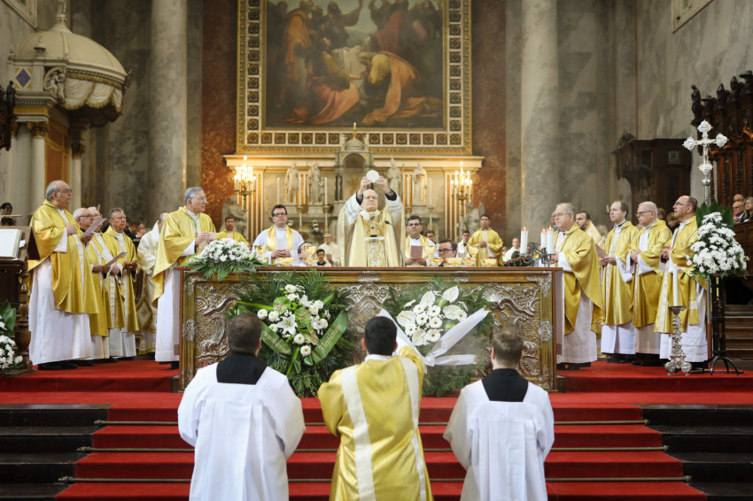 Francesco Moraglia velencei pátriárka prédikációjában emlékeztetett, hogy Mindszenty József bíboros egész életével személyessé és gyümölcsözővé tette a keresztség ajándékát, és hűségesen megvalósította azt a bátorság, a becsület, az Isten és a népe iránti feltétlen szeretet által. A magyar hercegprímást a személye elleni támadások, az üldöztetés, a hosszú és megalázó börtönévek, a kényszerlakhelyek sem tudták elnémítani és eltávolítani az igazságtól és a szeretettől. Emberi szemszögből nézve Mindszenty számtalan vereséget szenvedett, ám végül mégis győzedelmeskedett minden hazugság, testi és lelki erőszak, a különféle emberi alkudozások fölött. Nem aggódott a kívülről jövő fenyegetések miatt, mindig tudott a benső, hitből fakadó emberi, közösségi és lelki erejéből meríteni – emelte ki Francesco Moraglia, és hozzátette, főpásztorként így tudott szabad és hűséges maradni hivatásához, küldetéséhez, és így tudta folytatni az evangélium hirdetését.
