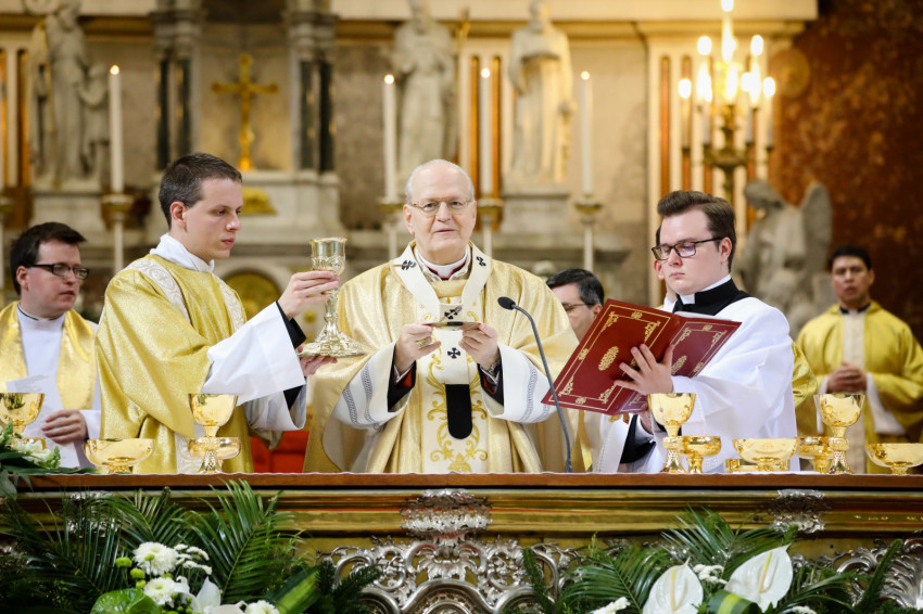 A főpásztor megköszönte Francesco Moraglia velencei pátriárkának, hogy elfogadta a felkérést a szentbeszéd elmondására, és hogy szolidáris, testvéri szeretettel viseltetik a magyar nép iránt. Erdő Péter külön szeretettel üdvözölte a fiatalokat, akik kerékpárral érkeztek Esztergomba, főleg hogy egy másik nagy kerékpáros esemény, a Giro d’Italia miatt sok akadályt kellett leküzdeniük.