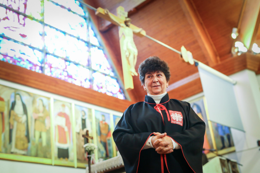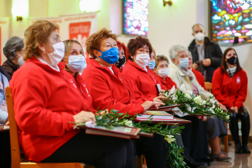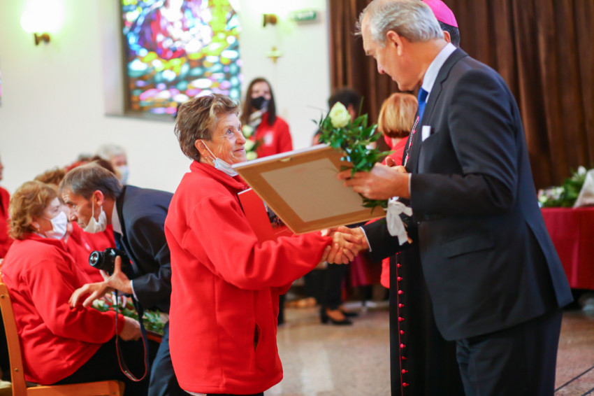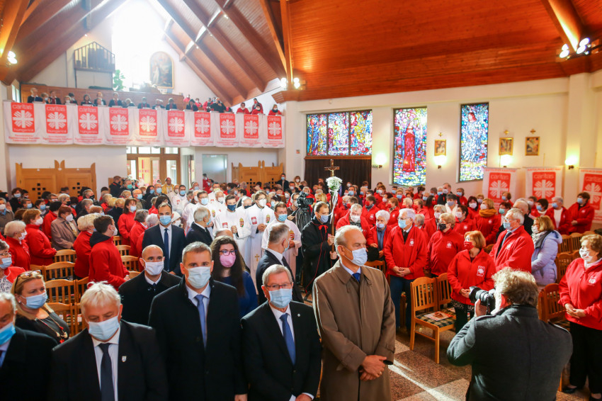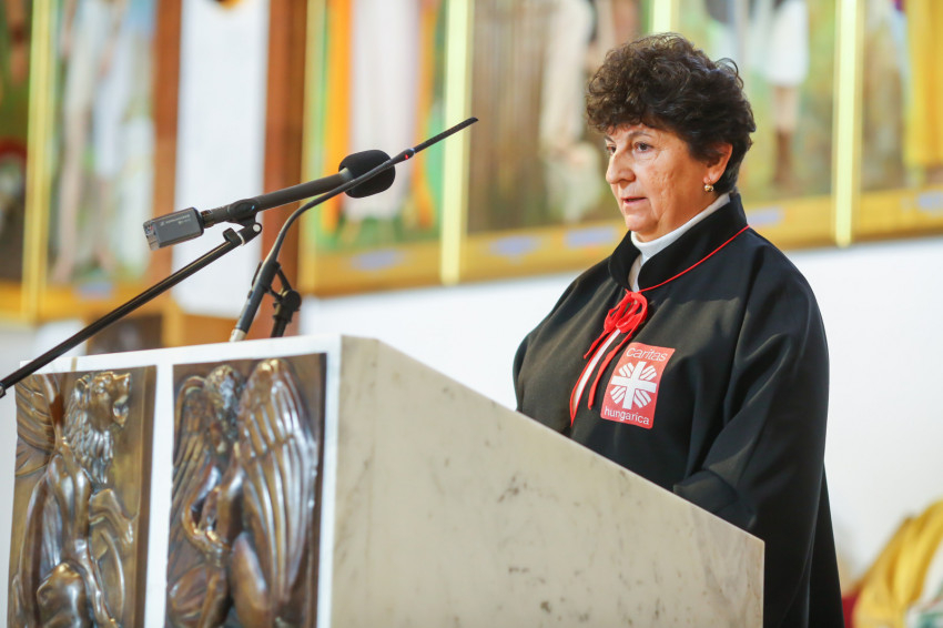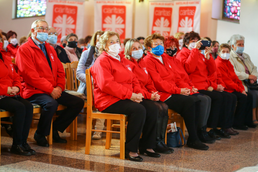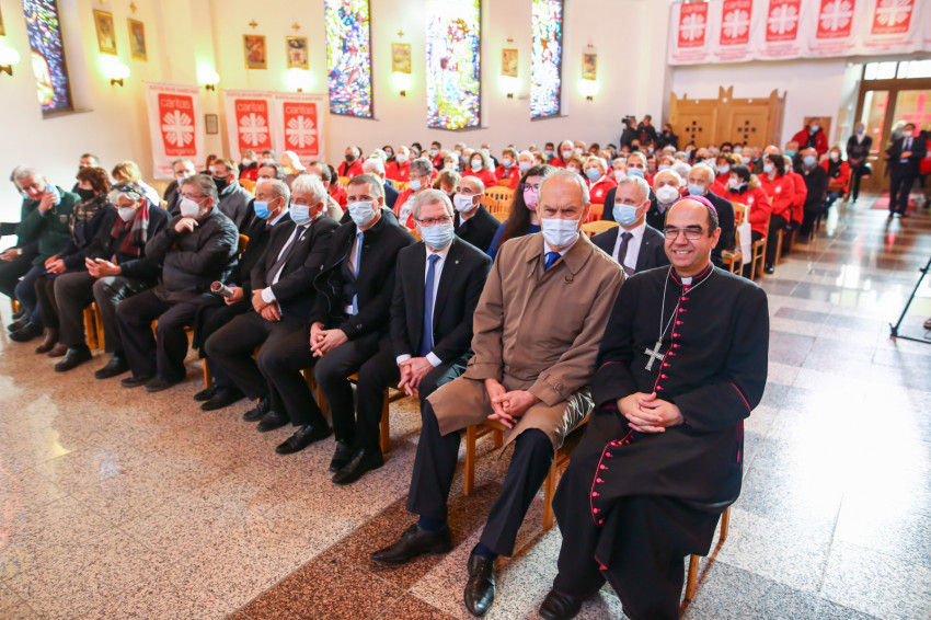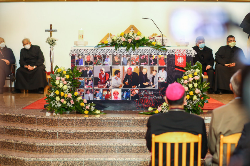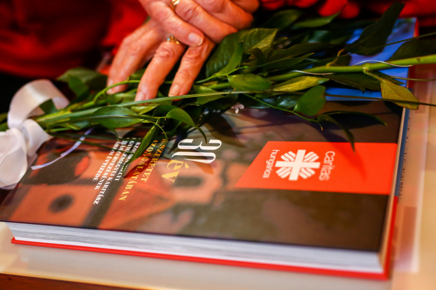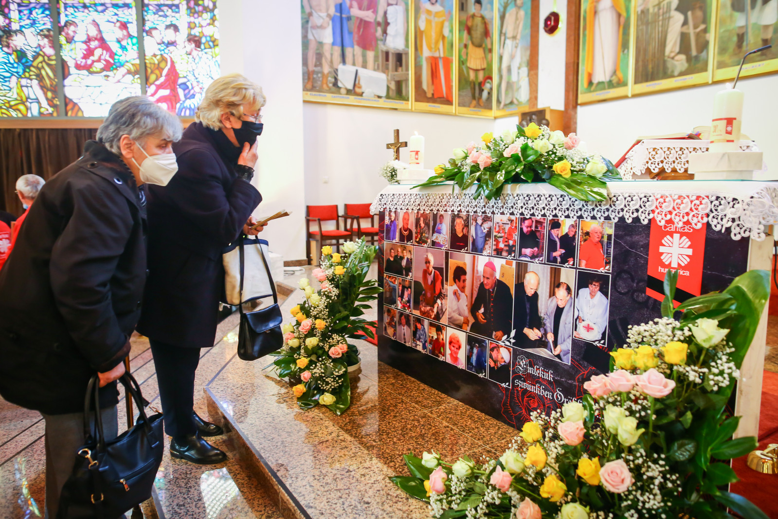 A templom padjait a Karitász piros színébe öltözött sokaság töltötte meg a jubileumi ünnepen. A karzaton a segélyszervezet zászlói. Az oltárasztal lábazatán fényképek, jelképesen ott voltak azok is, akik elhunytak már, a jubileumon rájuk is emlékeztek. Ott láttuk Konkoly István püspököt, aki 1991-ben újraindította a segélyszervezet életét, Győrvári Edith-et, aki Tuczainé Régvári Mariettával az első vezető volt a Karitász élén.