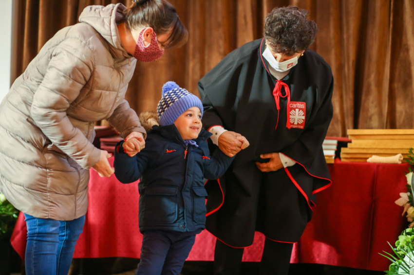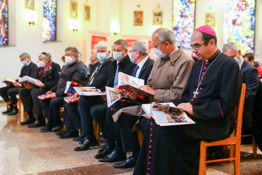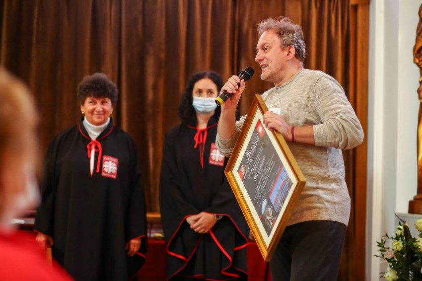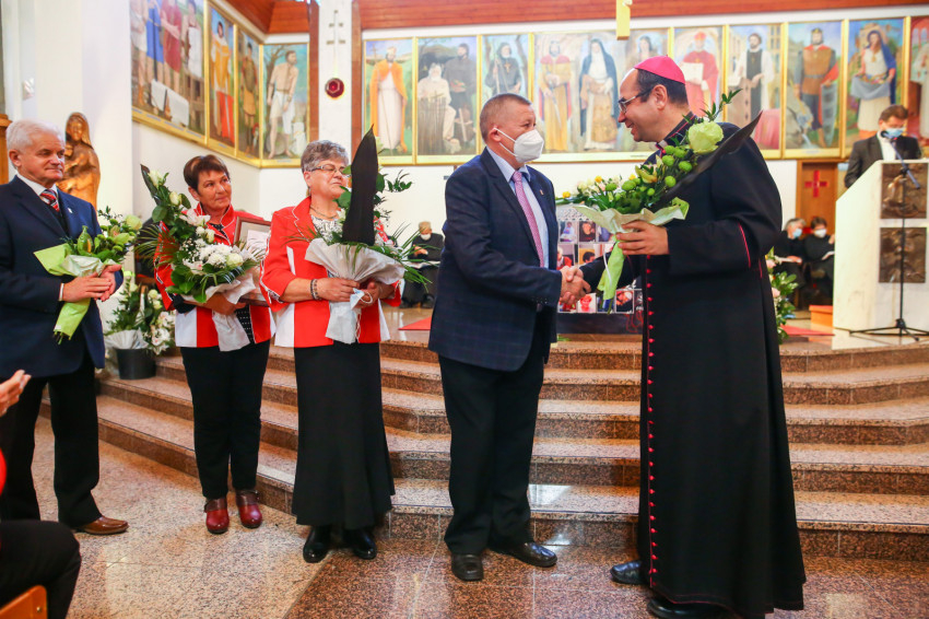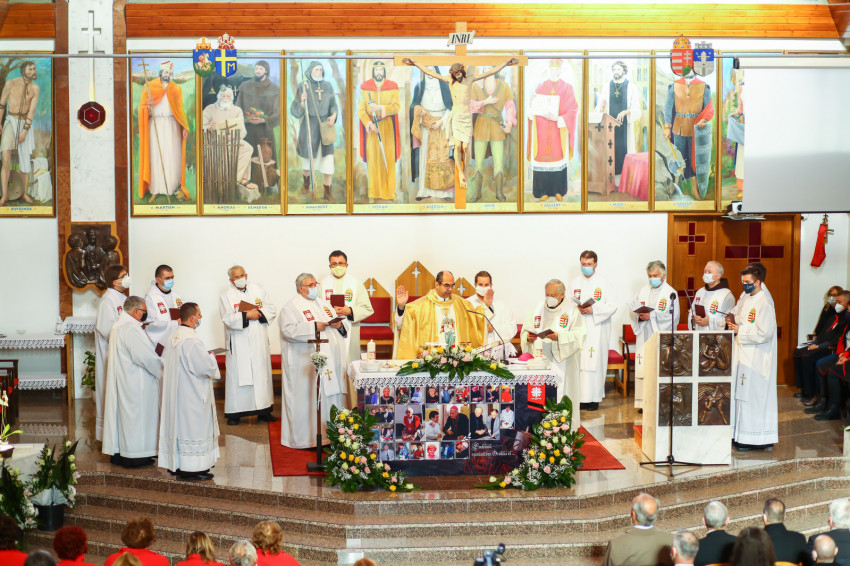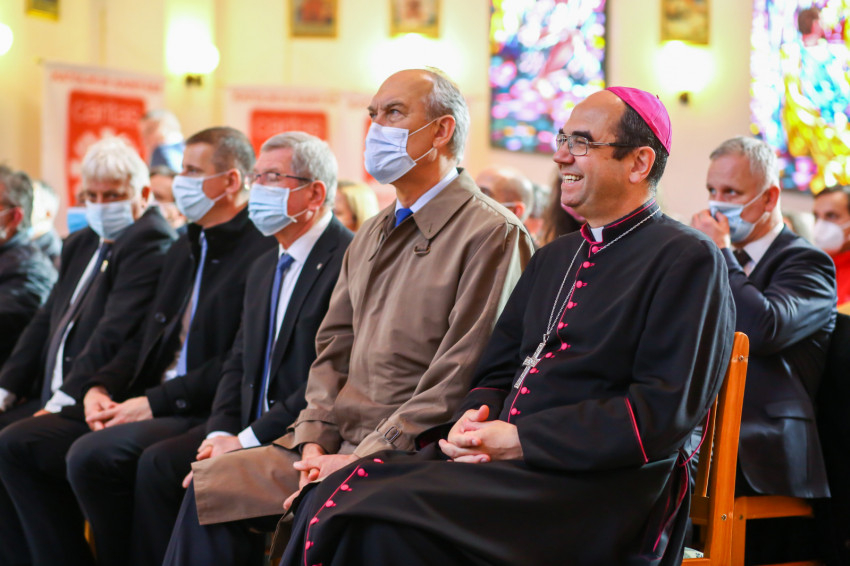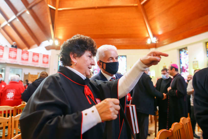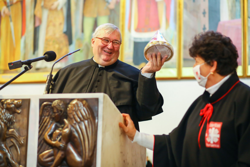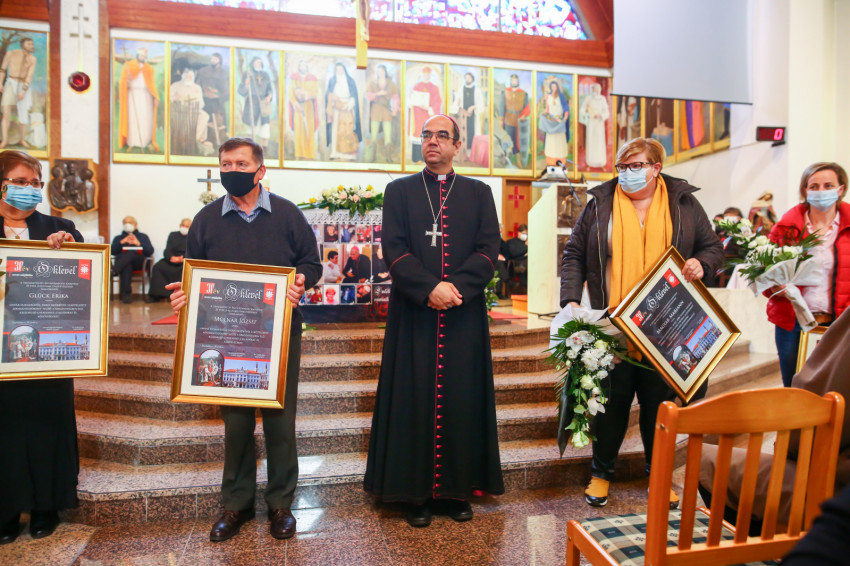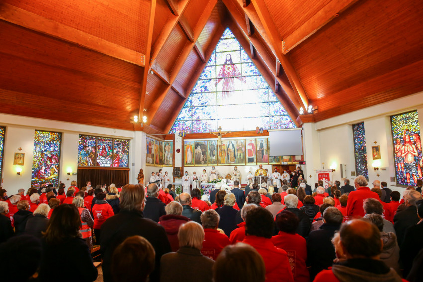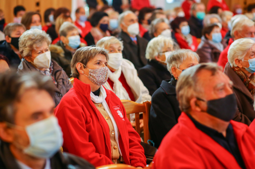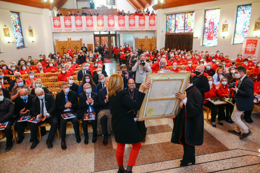 A templom padjait a Karitász piros színébe öltözött sokaság töltötte meg a jubileumi ünnepen. A karzaton a segélyszervezet zászlói. Az oltárasztal lábazatán fényképek, jelképesen ott voltak azok is, akik elhunytak már, a jubileumon rájuk is emlékeztek. Ott láttuk Konkoly István püspököt, aki 1991-ben újraindította a segélyszervezet életét, Győrvári Edith-et, aki Tuczainé Régvári Mariettával az első vezető volt a Karitász élén.