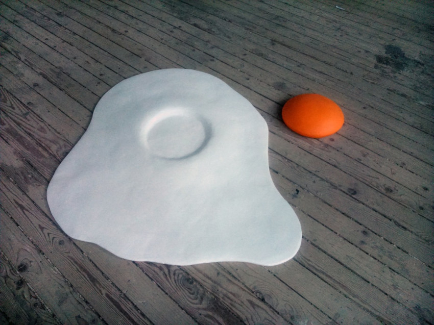 Egy hatalmas tojásfehérje és -sárgája foglalt helyet a padlón az egyik epreskerti szobrászműterem deszkáin. Legalább másfél méter átmérőjű. Hogy pontosan kinek az alkotása, az nem derült ki. Nem messze tőle az asztalon gyúródeszkát láthattunk, amint a sodrófa nyújtja a tésztát – amelyet azonban itt egy farönk helyettesít, az lapul ki fokozatosan. Aztán, a teremben továbbhaladva, a falon éppen egy vidraszerű lény lendül előre egy futballkapuban, próbálja elkapni a labdát, mivelhogy ő a kapus. Ezek a térinstallációk, szobrok kétségkívül nem illeszkednek a megszokott műalkotások sorába. A nagyközönség nem ezekhez szokott, s a konzervatívabb tárlatlátogató talán felháborodottan azt kérdezné: egyáltalán minek kell az ilyesmit kiállítani?