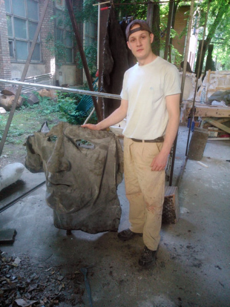 Az Epreskert kissé szedett-vedett összevisszasága nem sokat változott az évek során. Talán csak annyi, ami szembetűnik, hogy egyre több a parkoló autó és a terület legkülönbözőbb pontjain elhelyezett szobortöredék. A kert közepén álló kálvária tulajdonképpen változatlanul jó állapotban van. Felmentem a lépcsőn a tetejére, és amint körülnéztem, láttam, hogy az egyik hangárszerű szobrászcsarnoknál éppen dolgozik valaki. Mert nemcsak zárt műtermek vannak itt, a szabadban is lehet alkotni. A faragásra váró rengeteg farönk, deszka és más alapanyag között láttam, amint egy fiatalember valamiféle fekete lebernyeget akaszt fel egy kötélre. Kissé meggyűrődve lógott az elasztikus anyag. – Mi lesz ez? – kérdeztem az alkotót, Szabó Menyhértet, aki ötödéves, idén diplomázó szobrászhallgató. Kiderült, egy hatalmas emberi arcot formáz meg éppen, méghozzá gumiból. – Arcokat, karaktereket készítek, sok ilyet csináltam már korábban is. A kifejezés, az ember érdekel. Az, hogyan alakul ki és változik az évek során. Hogy miként rögzülnek idővel a vonások, és hogyan szilárdul meg, állandósul idővel az egyéniség – válaszolta Menyhért. – Sok szobrot láttam már kőből, bronzból, de gumiból még egyet sem – mondtam. – Ha elkészül, ez is kemény lesz, akár a sarokba is be lehet majd állítani. Először egy hatalmas agyag-, majd gipsznegatív készül, abból pedig a gumilenyomat – magyarázta a fiatal szobrász.