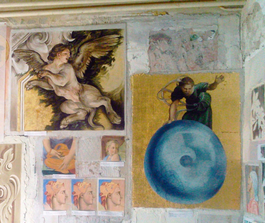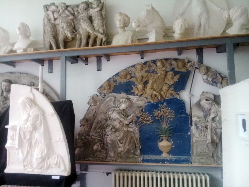 Az epreskerti műtermek közül számomra mindig a restaurátoroké a legérdekesebb. A reneszánsz egyik legjelentősebb alkotóműhelye volt a Robbia családé. Andrea della Robbia a majolikaszobrászat terén ért el rendkívüli sikereket a XV. század elején, Firenzében. Itt, az epreskerti kiállításon látható egy nagyon szép félköríves majolika, amely az angyali üdvözletet ábrázolja, és a Robbia-műhelyben készült eredeti másolata. A restaurátorhallgatóknak ezt kell lemásolniuk, és gipszből elkészíteniük, tanulmányozás céljából. Két jól sikerült domborművet láthattam a műteremben.