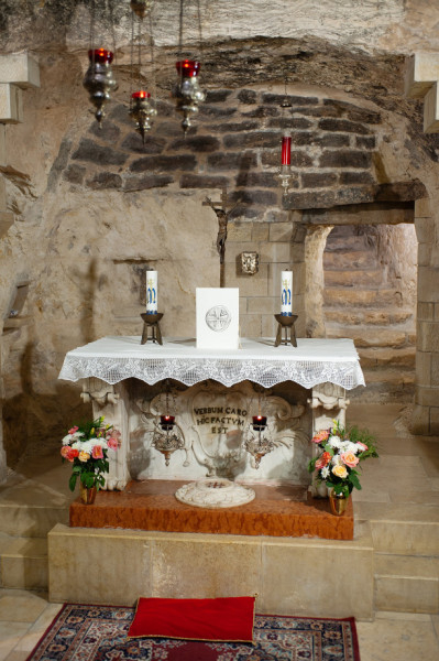 Elsőként a názáreti barlangnál helyezzük olvasónkat az oltár elé, az Angyali üdvözlet bazilikában. Az oltár latin felirata hangsúlyozza, hogy itt, ezen a helyen lett az Ige testté. Ez a megtestesülés helye, ahol Szűz Mária szíve alatt a Szentlélek erejéből megfogant Isten örök Fiának emberi élete. Az emberi élet tehát a fogantatással kezdődik. Ezen a helyen született meg a Máriát köszöntő legfontosabb imádságunk: az Üdvözlégy. Egy másik jelentős napi imádságunk is e helyről indult el, az Úrangyala ima, amit reggel, délben és este, a harangszóra elimádkozunk, felidézve Szűz Mária és Gábor főangyal párbeszédét.