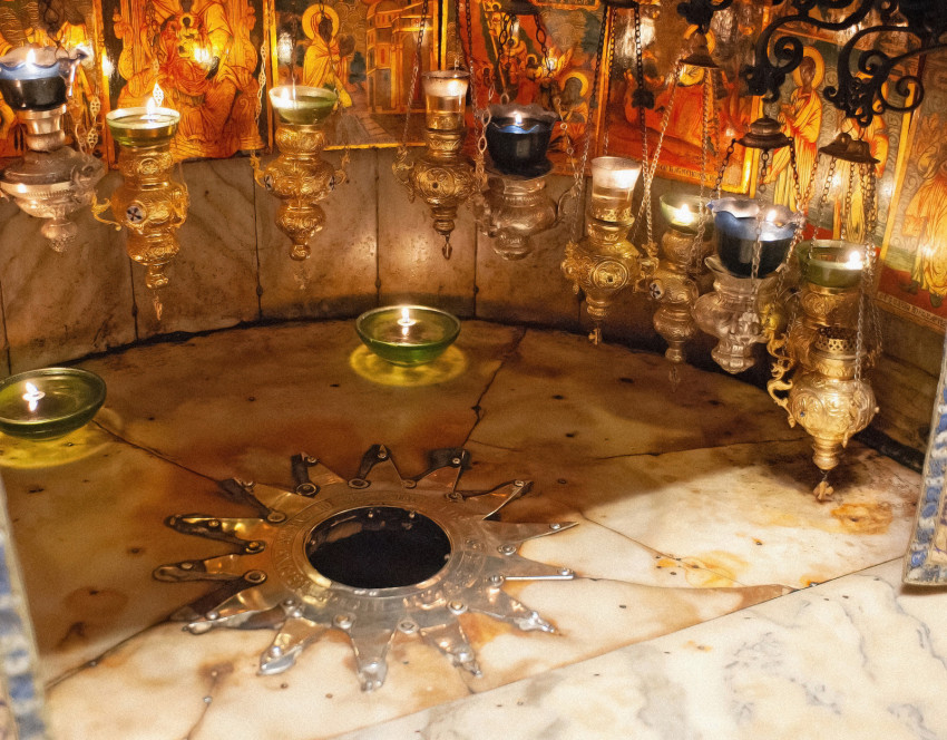 A galileai Názárettől kissé távolabb, a júdeai Betlehemben újabb fontos sziklabarlangokat találunk. A pásztorok az otthonukat jelentő barlangoktól indultak el ahhoz a betlehemi barlanghoz, ahol az angyal útmutatására megtalálták Máriát, Józsefet és a jászolban fekvő Kisdedet. Ez Jézus születésének barlangja a Születés templomában. Ezt a templomot Nagy Konstantin császár édesanyja, Szent Ilona építtette a 4. században. A születés helyét itt egy fehér márványba foglalt ezüstcsillag jelzi. Rajta a latin felirat: „Itt született Szűz Máriától Jézus Krisztus.” Ezen a helyen a zarándok ismét leborul, és megcsókolja a földet. Itt is megilletődötten helyezhetjük a szent helyre rózsafüzérünket az örvendetes titkokkal.