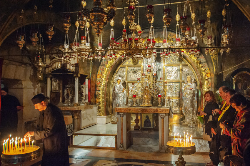 Bizony, ott van a születés helyének közelében a szenvedés hegye, a keresztre feszítés sziklája, a Szent Sír barlangja. Mélyen átérezte ezt a közelséget Szent II. János Pál pápa is 2000-ben, a jubileumi szentévben. Betlehemben mondott homíliájában utal erre: „Jézus bölcsője mindig a kereszt árnyékában van. A betlehemi születés csöndje és szegénysége egy valóságot alkot a Kálvária fájdalmaival, sötétjével és halálával. A bölcső és a kereszt a megváltó szeretetnek egy és ugyanazon misztériuma; a test, amit Mária jászolba fektetett, azonos a kereszten föláldozott testtel.” A fájdalmas titkokat felidézve a jeruzsálemi Szent Sír-templomban a Golgota sziklájához érinthetjük olvasónkat. Majd néhány lépés, és az élet győzelmének helyszínére érkezünk, a Szent Sír barlangjába, ahol Jézus holtteste nyugodott, és ahonnan a feltámadás dicsőségébe lépett. Ez itt a dicsőséges szentolvasó első állomása.