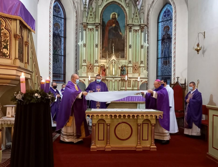 A főpásztor ezután a könyörgésben Isten áldását kérte. Majd felcsendült a Jöjj, Szentlélek, Úristen kezdetű ének, s a püspök és a plébános együtt „terítették meg” a megszentelt oltárt a „meghívott vendégek” számára.