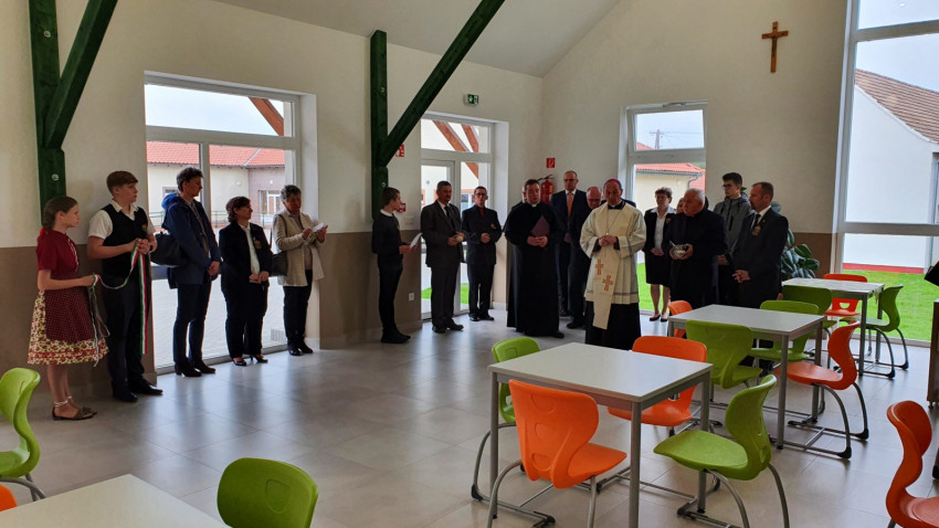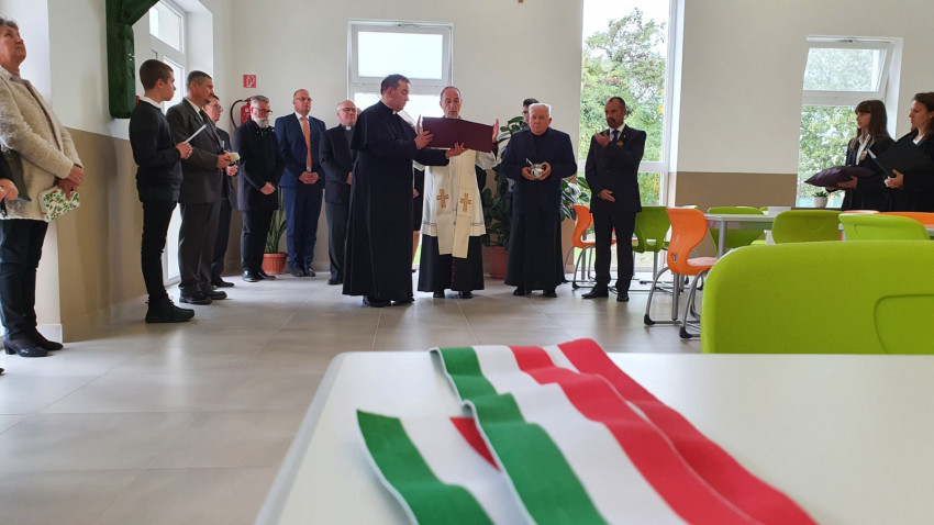 Ezt követően az ebédlőben a főpásztor megáldotta az új épületrészt, majd sor került a nemzeti színű szalag átvágására.