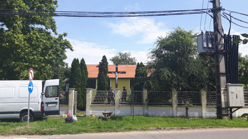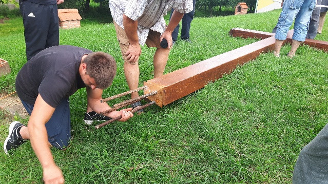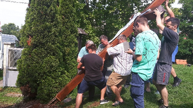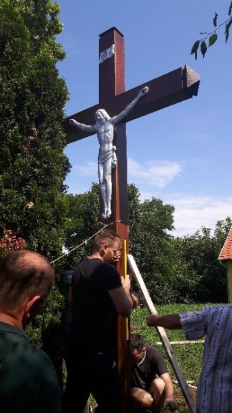 Tizenegyen jöttek össze a kis közösségből, hogy a keresztet a helyére emeljék. Először a régi kereszt talapzatából kellett a földet és az eltőzegesedett fadarabokat kiszedni, majd az új aljába 4 db 16-os betonacélt fúrtak, felállították és kiöntötték betonnal.
