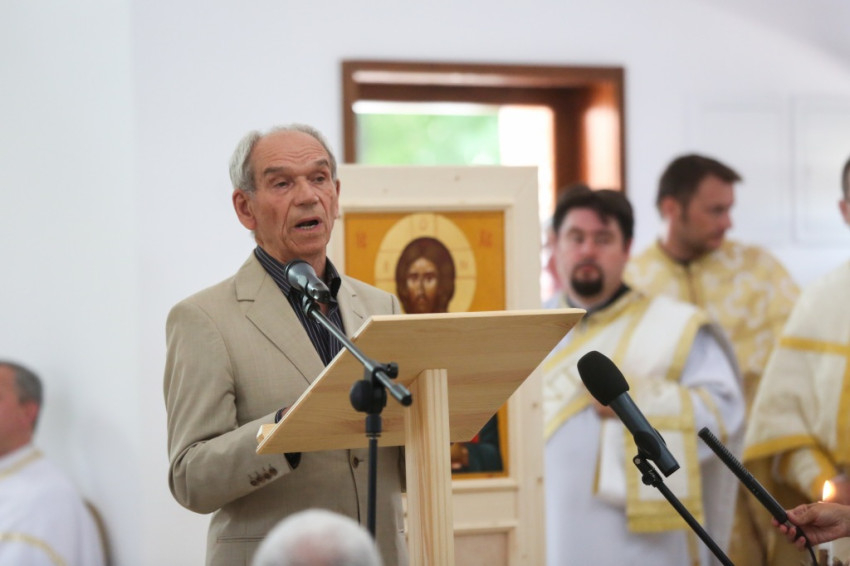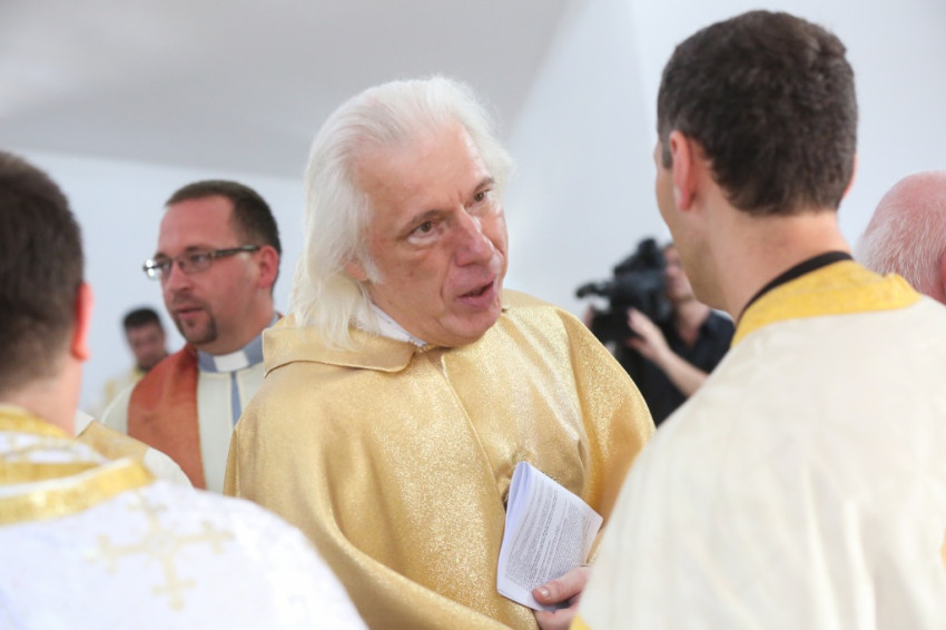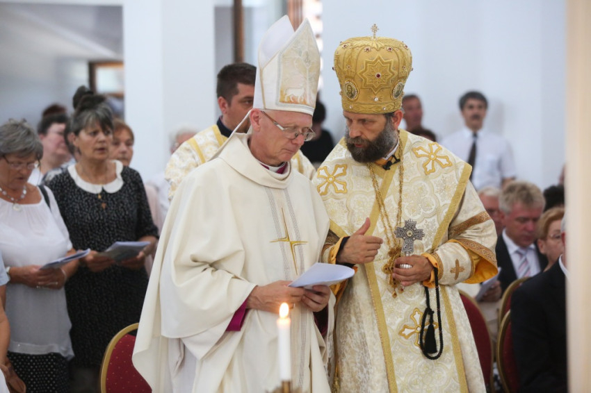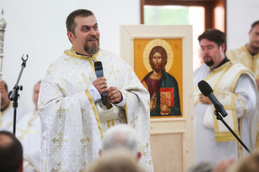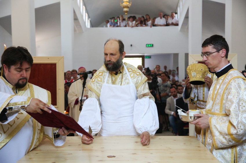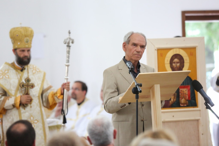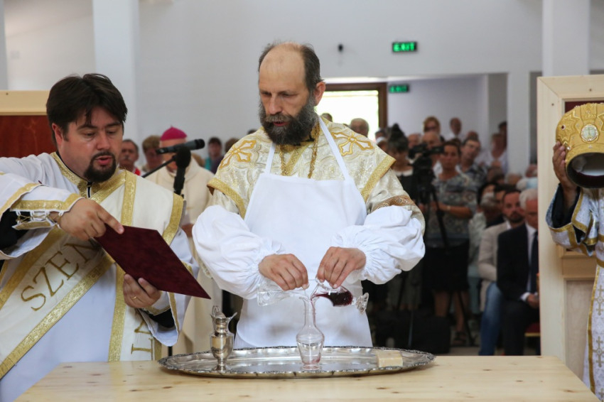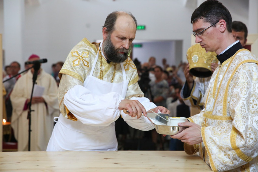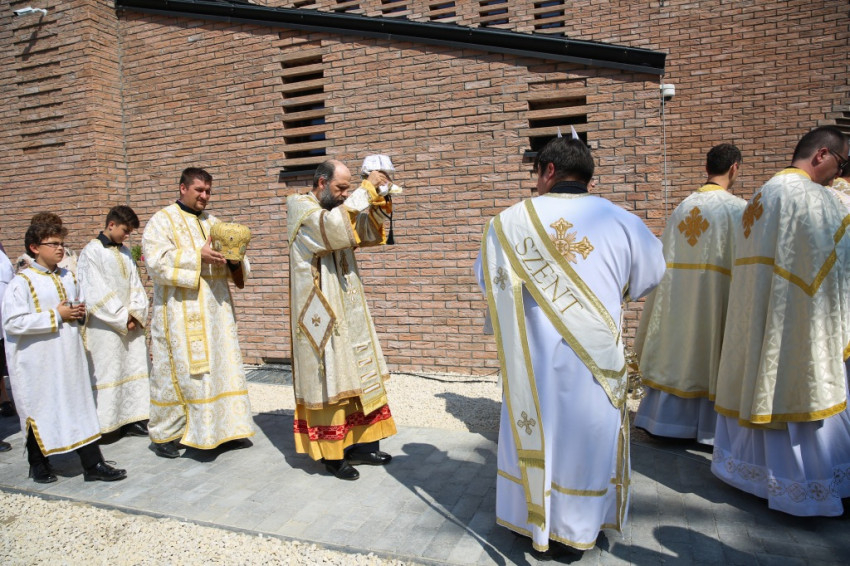 Balog Zoltán a templom elnevezéséről, Péter és Pál nevének jelentéséről elmélkedve kezdte beszédét. Péter neve kősziklát jelent, Pálé azt, hogy kicsi, második (Péter után), utolsó. Ez életünk két alapösszetevőjére utal: hogy ki akarunk kiemelkedni a többiek közül, de aztán meg kell tanulnunk kicsinek lenni. És megesik, hogy akkor vagyunk a legmélyebben, amikor a legmagasabban érezzük magunkat. A sziklának pedig porrá kell töretnie, hogy a termékenység alapja lehessen. Amikor gyenge vagyok, akkor vagyok a legerősebb, mint Pál apostol mondja, és ez a jó életprogram. Lehet, hogy éppen akkor vagyunk erősek, amikor mások kicsinek látnak bennünket. Így van ez Dunakeszin is. Kívülállók azt kérdezhetik, mit keres itt egy görögkatolikus templom. Templomnak ott kell épülnie, ahol hívek vannak. Ez térfoglalás, üres tér ugyanis nincsen. Ha a keresztények nem foglalnak teret, majd megteszik helyettük mások: az értéktelenség, a hamisítványok. Ha a térképre tekintünk, észre fogjuk venni az egybeesést: ugyanott van sok görögkatolikusok Magyarországon, ahol sok roma. És éppen a görögkatolikus egyház tesz a romákért, a gyermekvédelem, az idősek és leszakadók segítése terén a legtöbbet. Ez pedig templom nélkül nem megy. Az elmúlt hat évben a Kárpát-medencében ezertizennyolc templom újult meg és hatvan új épült. Micsoda lelki éhséget jelez ez! Maradjon is meg ez az éhség, mert a lelki megújuláshoz szükség van rá.