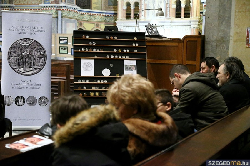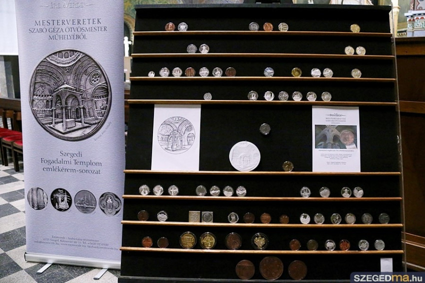 Nem előzmény nélküli az új érem, amely egy sorozat tagja. Fritz Mihály érem- és szobrászművész ugyan nem tervezte ezt a sorozatot, „csak születtek a darabok”. A legújabb veret egyik oldalán az áthelyezett baldachin van, a másikon a dóm a szerb templom felől nézve, „Szegedi Fogadalmi Templom 1879–1930” felirattal. Átmérője 42 milliméter, anyaga réz, amelyet az úgynevezett kénmájazás módszerével antikoltak. Az éremből egyelőre negyven darab készült, de Szabó Géza ötvösmester bízik benne, hogy verhet még belőle. Az éremkép ötlete is az ötvösmestertől származott, akinek határozott elképzelései voltak, de két-három terv elkészítése után találkoztak a szándékai Fritz Mihályéival. A művész nagyon izgalmasnak látja a dóm tereit, ugyanúgy, mint az érem tervezési folyamatát. Előbb nagy gipsznegatívba készíti el a formát, majd ezt kicsinyítik le, hogy éremméretű legyen a darab – így történt ez a mostani veretnél is. „Jó érzés a végleges munkát látni, mert más a méret, az anyag, a fényezés. Több változat esetén izgalmas, hogy melyik lesz a legszebb” – foglalta össze Fritz Mihály.