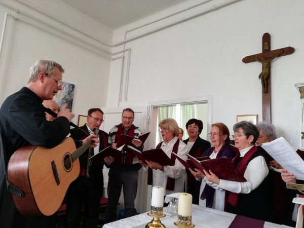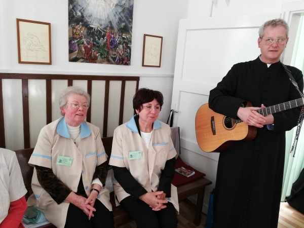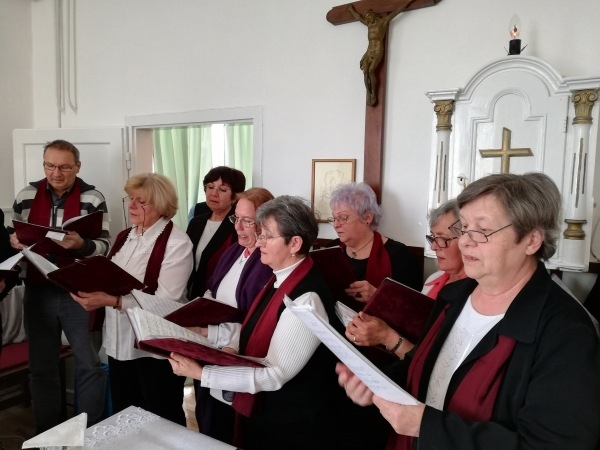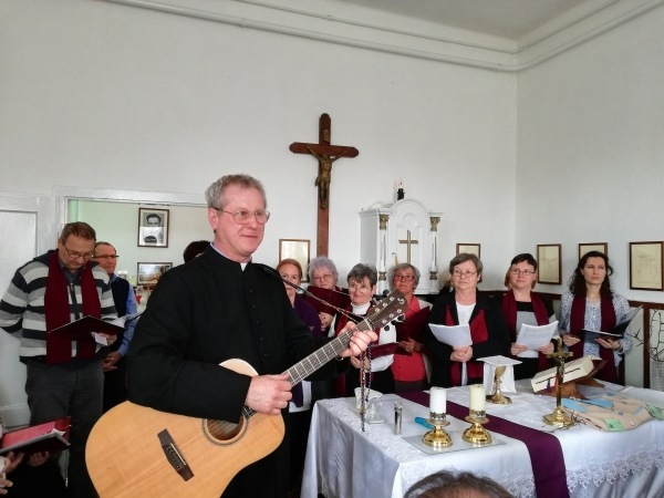 A kórus tizennégy tagja Kómár István atya gitáros kíséretével adott műsort.