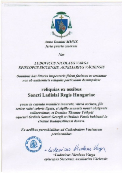 Az ereklyét, melynek eredetiségét Varga Lajos váci segédpüspök igazolta, Szent László ünnepét követően adták át. Vasárnaponként a templom mellékoltárán kap helyet, a hívek itt róhatják le tiszteletüket előtte. A plébános arra biztat, hogy kérjük bizalommal Szent László segítségét, hisz Erdély fővédőszentjének pártfogására mindig számíthatunk.