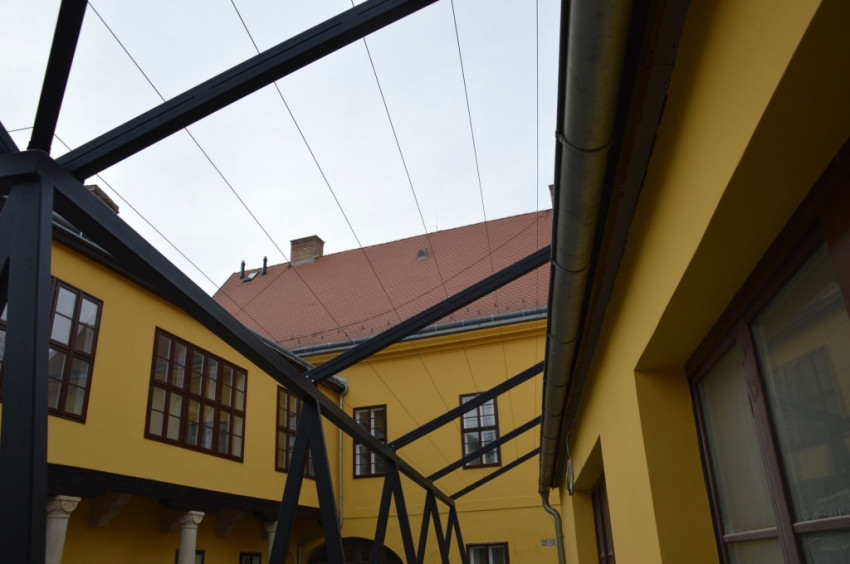 A belső munkálatok a burkolatok és a falfelületek felújításánál tartanak, a napelemek és a kúszónövényeket tartó, árnyékoló rendszer már a helyén van, az udvar burkolása, illetve a környezetrendezés még hátravan.
