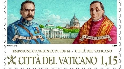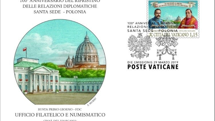 A Szentszék és Lengyelország kapcsolatai 1555-ben kezdődtek, amikor megérkezett Varsóba az első nunciusi rangot viselő, rezidens pápai képviselő. Az 1600-as évek elején írták alá az első megegyezést a két állam között. 1795-ben azonban Lengyelországot a szomszédos hatalmak (Oroszország, Ausztria és Poroszország) három részre szakították, és megszűnt önálló államként létezni. 1918-ban nyerte vissza függetlenségét, és egy évre rá állították helyre a diplomáciai kapcsolatokat a Szentszékkel. Erre emlékezve a Vatikán március 29-én bélyeget ad ki Lengyelországgal közösen 1 euró 15 cent értékben. A bélyeget Stefano Morri tervezte, XV. Benedek pápát és Józef Piłsudski marsallt ábrázolja. XV. Benedek pápasága idején történt meg a kapcsolatok újrafelvétele, Piłsudski marsall pedig az első világháború után a lengyel függetlenség elnyerésének legnagyobb előmozdítója volt.