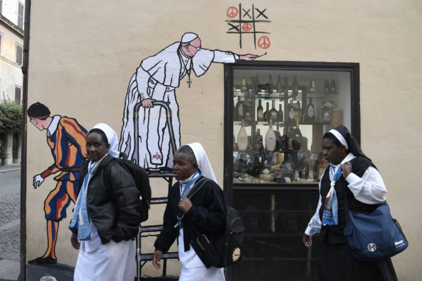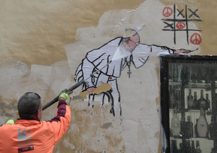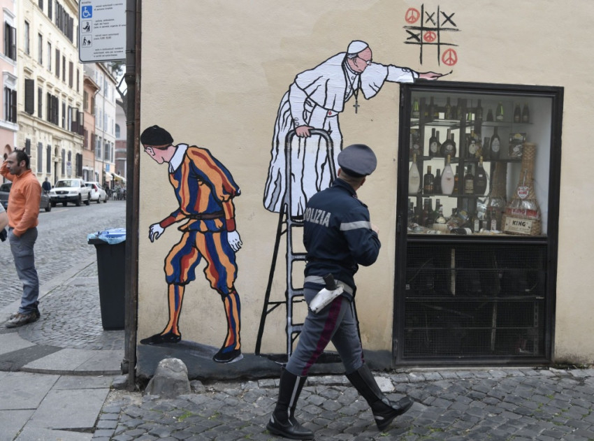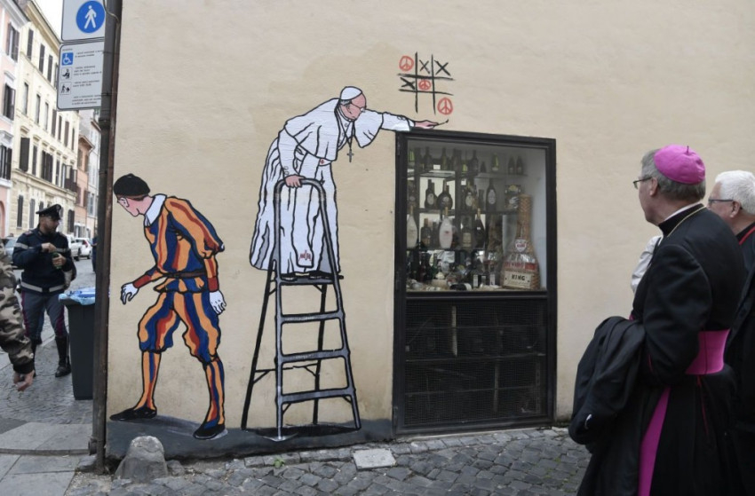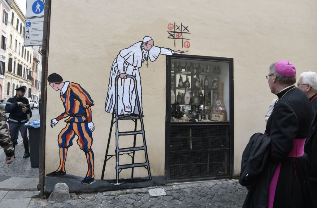 Ferenc pápa éppen egy amőbaszerű társasjátékot nyert meg Maupal street art alkotásán: berajzolta a harmadik békejelet, nyújtózkodva, bal kézzel, épphogy elérve a megfelelő helyet. Az absztrakt stratégiai társasjátékban, melyet angolul tic-tac-toe-nak vagy OXO-nak neveznek, természetesen köröket szoktak rajzolni a játékosok, nem békejeleket.