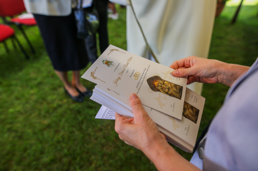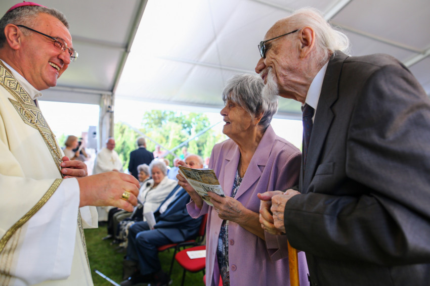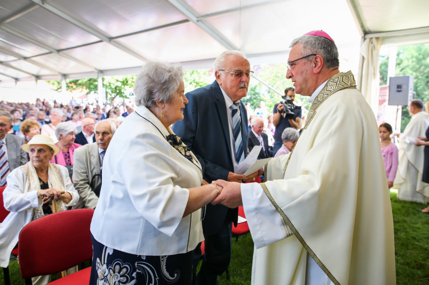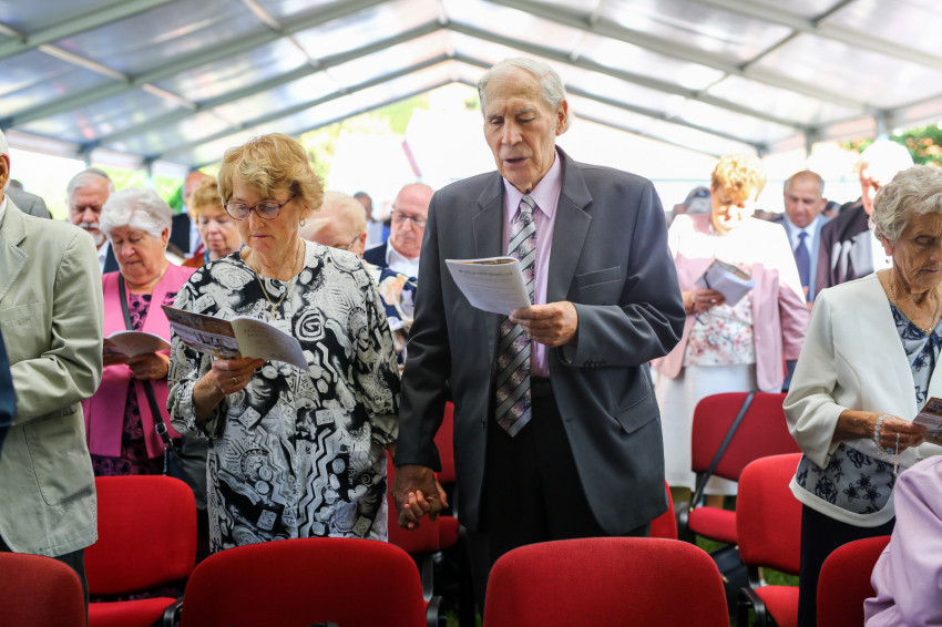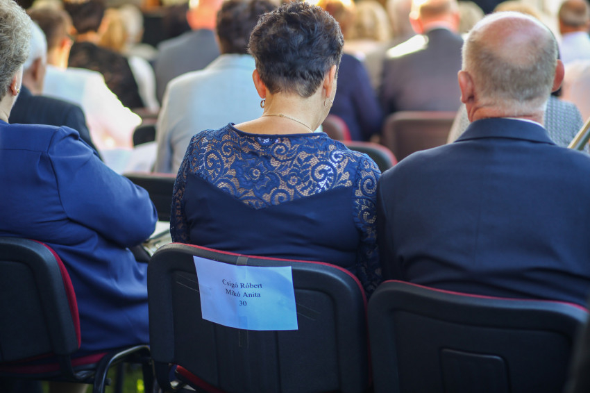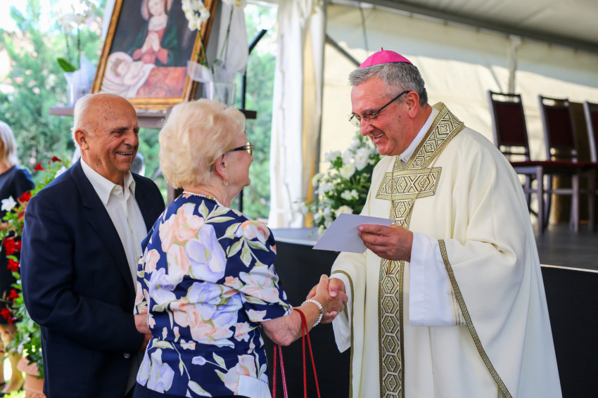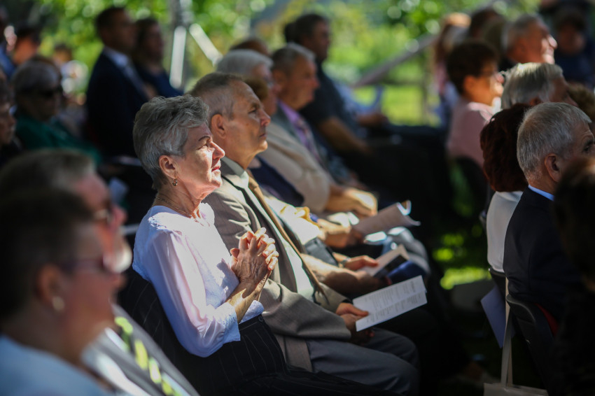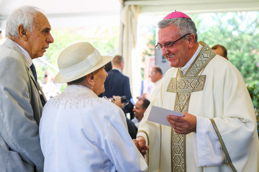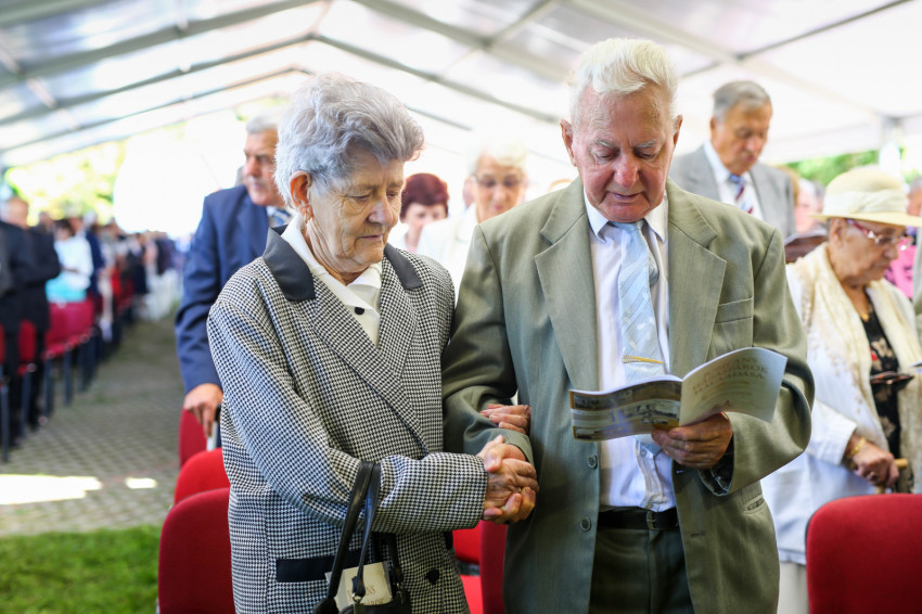 740 ember ül a győri Püspökvár kertjében felállított sátor alatt. 370 házaspár, akik az 5., 10., 15., vagy éppen 70. évfordulójukat ünneplik. A sátor körül elhelyezett padokon hozzátartozóik, nagyszülők, gyerekek, unokák népes serege. Ünneplőben minden – a kék égen ragyog a nap, az utóbbi napok esőzéseinek köszönhetően friss zöldben virul az igényesen gondozott, rendhagyó kert a gyümölcsfákkal, zöldségültetvénnyel.