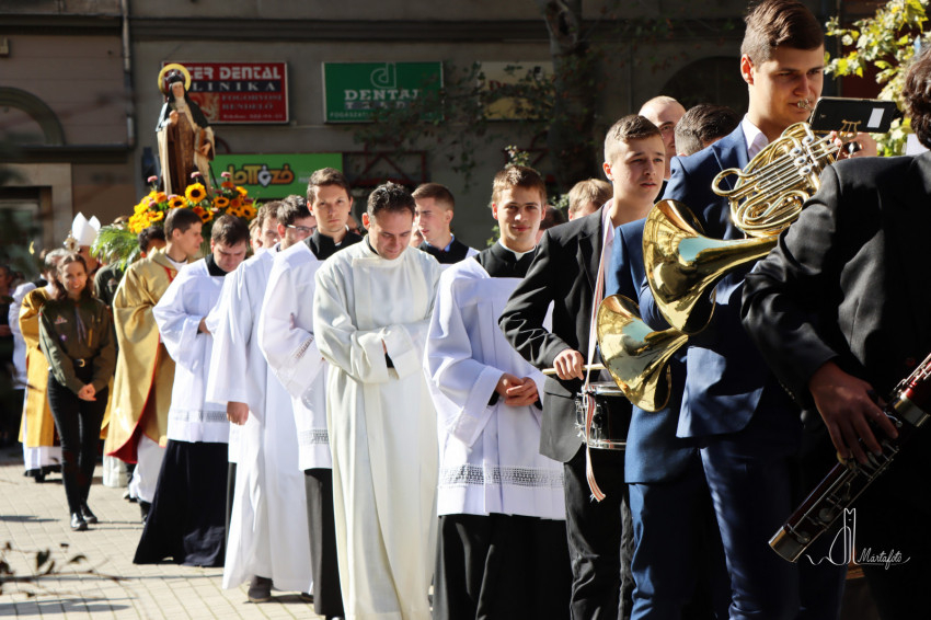 A körmeneten a Bartók Konzervatórium fúvószenekara játszott, akik a szentmise előtt is toronyzenével örvendeztették meg a búcsúba érkezőket.