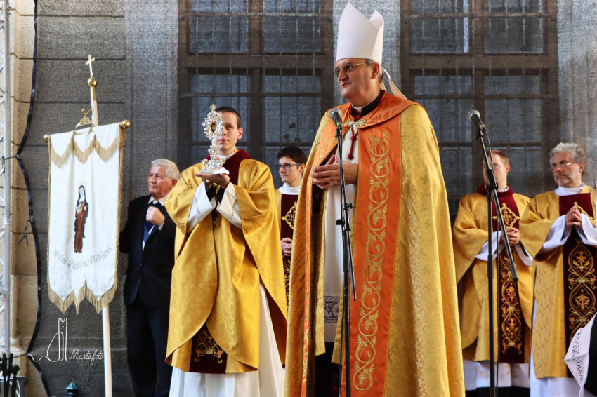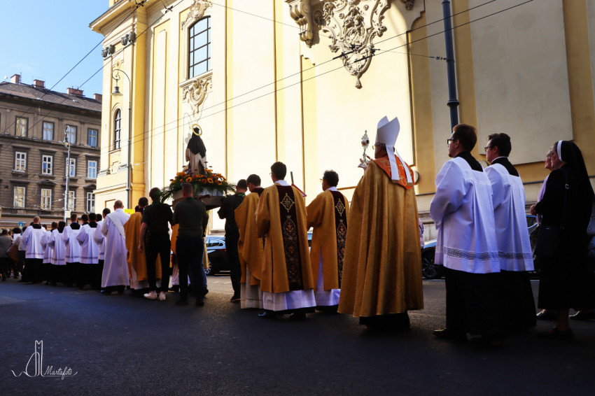 Majd elindult a Szent Teréz-körmenet a templom körül, melyben a temolom jubileumára megújult ereklyetartóban hordozták körbe Szent Teréz ereklyéjét, és a cserkészek vitték a kerület védőszentjének napraforgóval feldíszített szobrát.