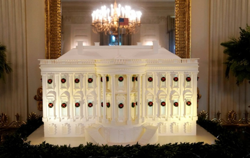 A Fehér Ház karácsonyi díszítésének elmaradhatatlan eleme az épület mézeskalácsból készült mása: idén a hátteret adó fehéret piros szalagos zöld fenyőkoszorúkkal egészítették ki.