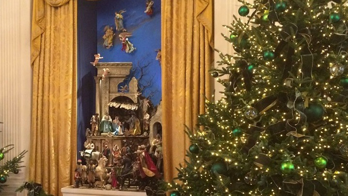A first lady, Melania Trump először november 27-én, Twitter-oldalán tette közzé a videót a karácsonyfákról, szalagokról, koszorúkról, süteményekről és a dekoráció egyéb elemeiről: köztük egy szépen kidolgozott tradicionális betlehemről, melyre rá is közelít a kamera. A kis, fülkeszerű mélyedésben álló betlehem 1967 óta látható az úgynevezett Keleti Szobában; az elmúlt években terjedő híresztelésekkel szemben Obama elnök idején is a szokott helyén állt.