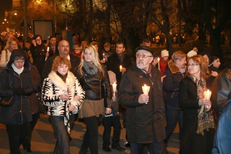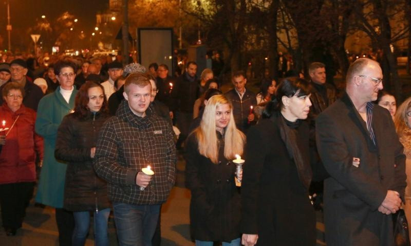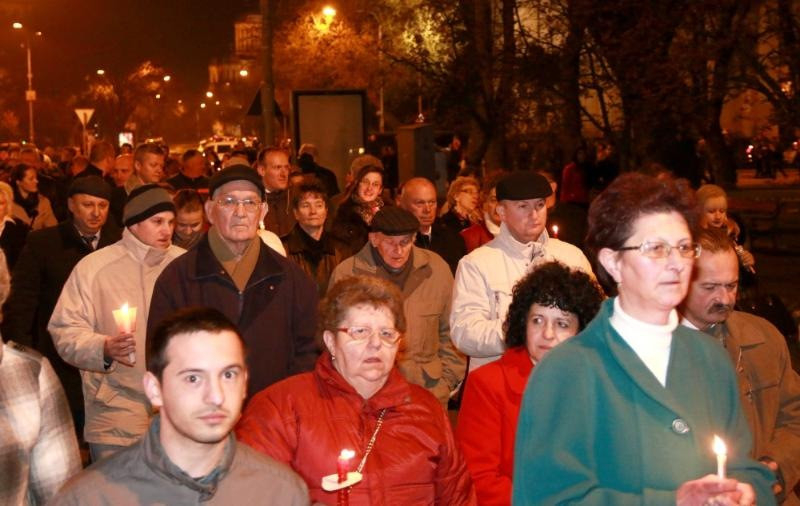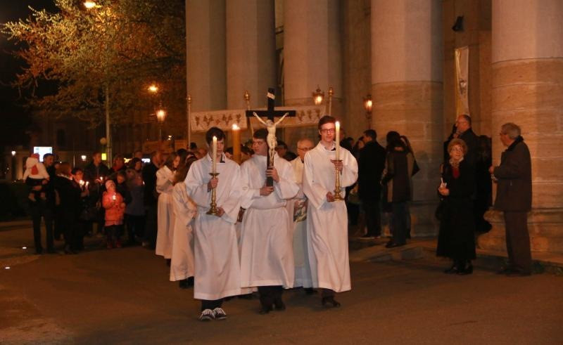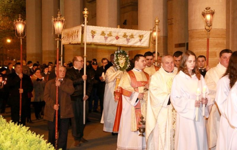 Nagyszombaton este tűzszenteléssel kezdődött a feltámadási vigília szertartás aa szatmárnémeti székesegyház főbejárata előtt. Schönberger Jenő püspök a megáldott tűzzel gyújtotta meg aztán a húsvéti gyertyát, amellyel jelenlevő papjai és ministránsai körében fél kilenckor bevonult a teljesen sötét templomba. A hívek ekkor már megtöltötték a padsorokat és sokan álltak is, úgy követték a szertartást. „Krisztus világossága!” – énekelte háromszor Barta Barnabás segédlelkész, amelyre a hívek minden alkalommal válaszoltak: „Istennek legyen hála!”