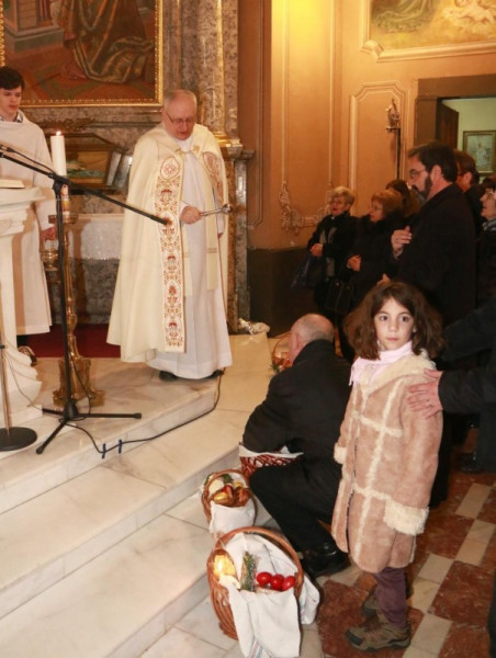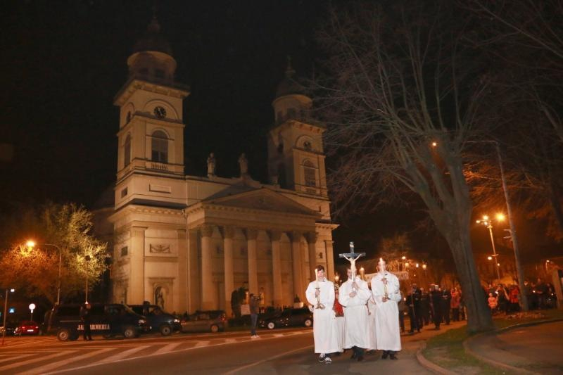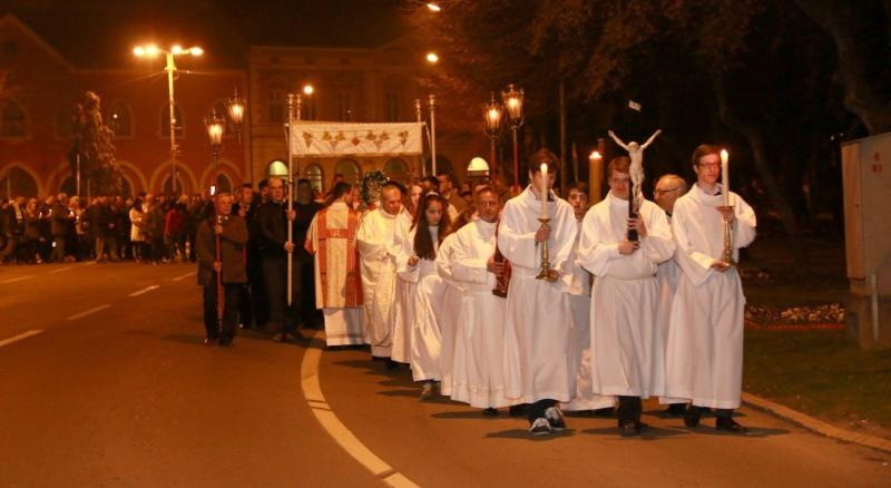 A homília után a hívek megtették ezt a fogadalmat: a püspök atya megáldotta a keresztkutat és a vizet, a ministránsok újra elvitték a húsvéti gyertya tüzét a híveknek, akik égő gyertyával a kezükben újították meg keresztségi ígéreteiket. Az áldozás után régi magyar hagyomány szerint a szent sírnál „keltegették” Jézust, onnan indult el aztán a körmenet – a régi főtér parkját megkerülve. A templomba visszaérkezve a Te Deumot énekelték együtt, Schönberger Jenő püspök négy – magyar, román, német és olasz – nyelven kívánt boldog húsvétot, majd megáldotta a hívek által, kosárban elhozott eledeleket.