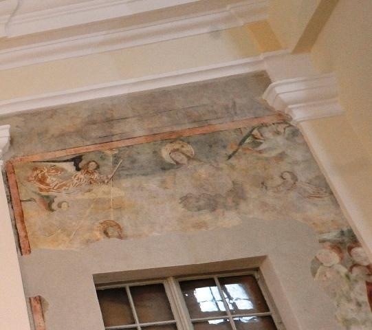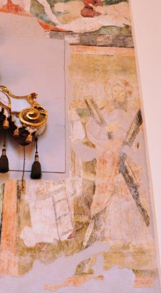 Egy másik részen, a falfestmény jobb oldalán a Szentháromság ábrázolása ismerhető fel töredékesen: a központi emberalak az Atya, kezében tartja a Szentlelket jelképező galambot, mely egy kereszttel ellátott gömbön helyezkedik el. Jézus ábrázolása igencsak halványan látható, a négy sarokban a fájdalmas Jézust megkínzó eszközöket mutatják be az angyalok.