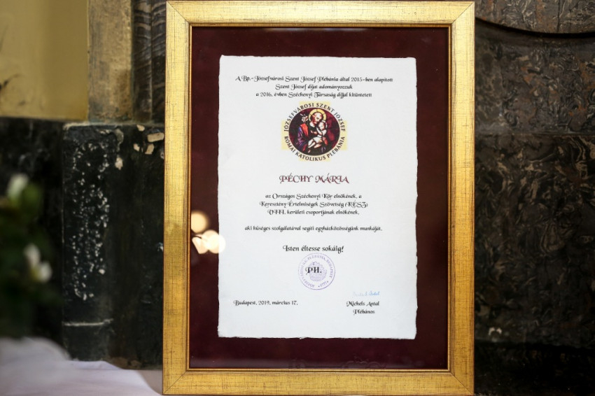 A szentmise befejező szertartása előtt Michels Antal plébános – aki egykor az elismerés kezdeményezője, alapítója volt – átadta a Szent József-díjat, melyet minden évben az egyházközség egy-egy kiemelkedő munkát végző tagjának adományoznak. Idén Péchy Mária, az Országos Széchenyi Kör elnöke kapta az elismerést, akit másodszor választottak meg a KÉSZ Józsefvárosi Csoport vezetőjének, s szorgalmas munkájának is köszönhetően ez az egyik legszilárdabb csoportja az egyházközségnek. A plébános hozzátette: Péchy Máriához bármikor, bárki fordulhat segítségért, áldozatos munkájára mindig lehet számítani. A Szent József-díjat ebben az esztendőben Erdő Péter bíboros kezéből vehette át a díjazott. A pápai és a magyar Himnusz eléneklésében, illetve a szentmise zenei szolgálatában a Bárdos Kórus vett részt.