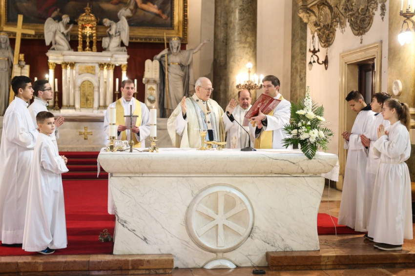A szentmise elején Michels Antal plébános köszöntötte a főpásztort, valamint a kerület polgármesterét, Sára Botondot, illetve két helyettesét; a zenei szolgálatot végző Bárdos Kórus tagjait, és mindazokat, akik eljöttek az ünnepi szentmisére. A plébános hozzátette: különös öröm a mai nap, hiszen a templom renoválása is kezdetét veszi. Kiemelte az önkormányzattal kialakult gyümölcsöző együttműködést, mely a 220 éves templom felújításában is megnyilvánul.