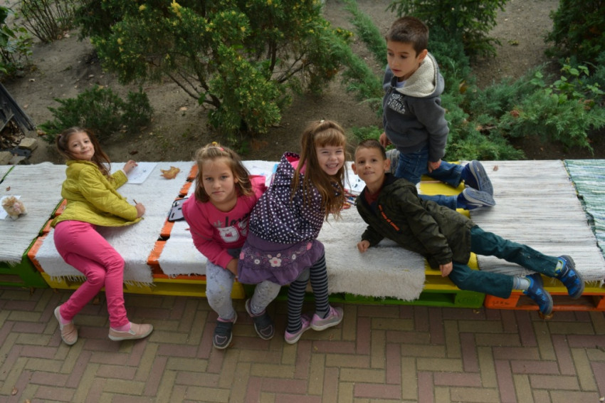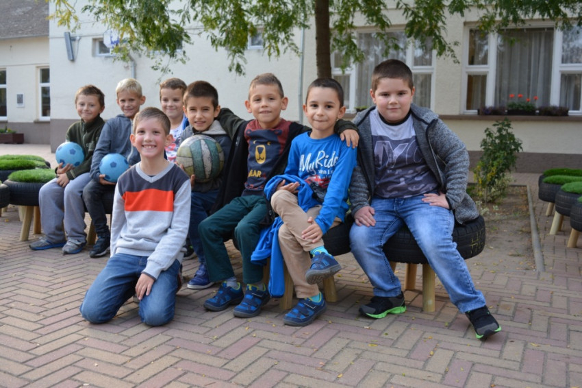 Szeptember óta minden igyekezetével azon volt a pedagógus közösség, hogy színes, vidám, ízléses, gyermekbarát otthont biztosítson tanulóinknak. Nagyot álmodott, amikor egy pihenősarok építését kezdte el tervezgetni. Ezután – hála a bajai Szent József Plébániának, a lelkes családoknak és a szülői munkaközösségnek – hatalmas összefogással ez az álom megvalósult. Pedagógusok, szülők és gyerekek együtt szépítették, építették az udvari pihenősarkot, de számos látványos, kreatív kiegészítő is gyarapítja a külső környezetet. Mindez – ökoiskola lévén – az újrahasznosítás jegyében, hiszen a legtöbb elem hulladékból készült.
