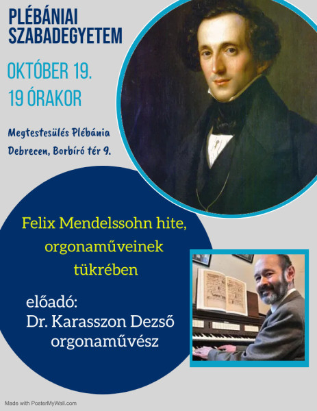 Az első alkalommal, október 19-én este 7 órától Karasszon Dezső orgonaművész tart előadást Felix Mendelssohn hite, orgonaműveinek tükrében címmel.